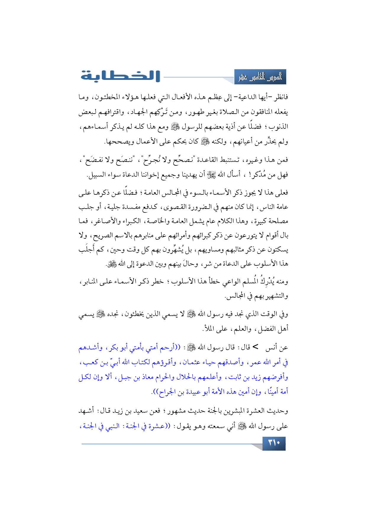وفي الوقت الذي نجد فيه رسول الله -صلى الله عليه وسلم- لا يسمي الذين يخطئون، نجده -صلى الله عليه وسلم- يسمي أهل الفضل والعلم على الملأ عن أنس -رضي الله عنه- قال: قال رسول الله -صلى الله عليه وسلم-: ((أرحم أمتي بأمتي أبو بكر، وأشدهم في أمر الله عمرهم، وأصدقهم حياء عثمان، وأقرؤهم لكتاب الله أبي بن كعب وأفرضهم زيد بن ثابت وأعلمهم بالحلال والحرام معاذ بن جبل، ألا وإن لكل أمة أمينًا، وإن أمين هذه الأمة أبو عبيدة بن الجراح)).