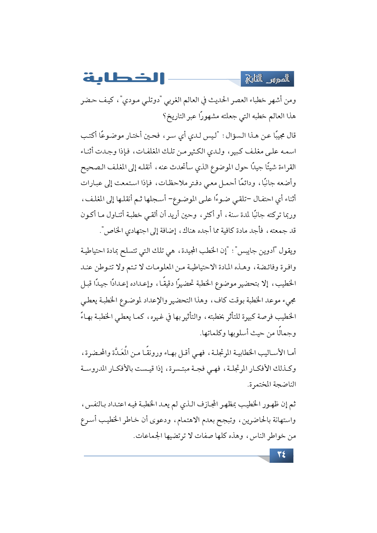 ومن أشهر خطباء العصر الحديث في الغرب العالم الغربي "دوتلي مودي". كيف حضر هذا العالم خطبه التي جعلته مشهورًا عبر التاريخ؟ قال مجيبًا عن هذا السؤال: "ليس لدي أي سر حين أختار موضوعًا أكتب اسمه على مغلف كبير، لدي الكثير من تلك المغلفات، فإذا وجدت أثناء القراءة شيئًا جيدًا حول الموضوع الذي سأتحدث عنه أنقله إلى المغلف الصحيح وأضعه جانبًا، ودائمًا أحمل معي دفتر ملاحظات، فإذا استمعت إلى عبارات أثناء أي احتفال -تلقي ضوءًا على الموضوع- أسجلها ثم أنقلها إلى المغلف، وربما تركته جانبًا لمدة سنة أو أكثر. وحين أريد أن ألقي خطبة أتناول ما أكون قد جمعته، فأجد مادة كافية مما أجده هناك، إضافة إلى اجتهادي الخاص".