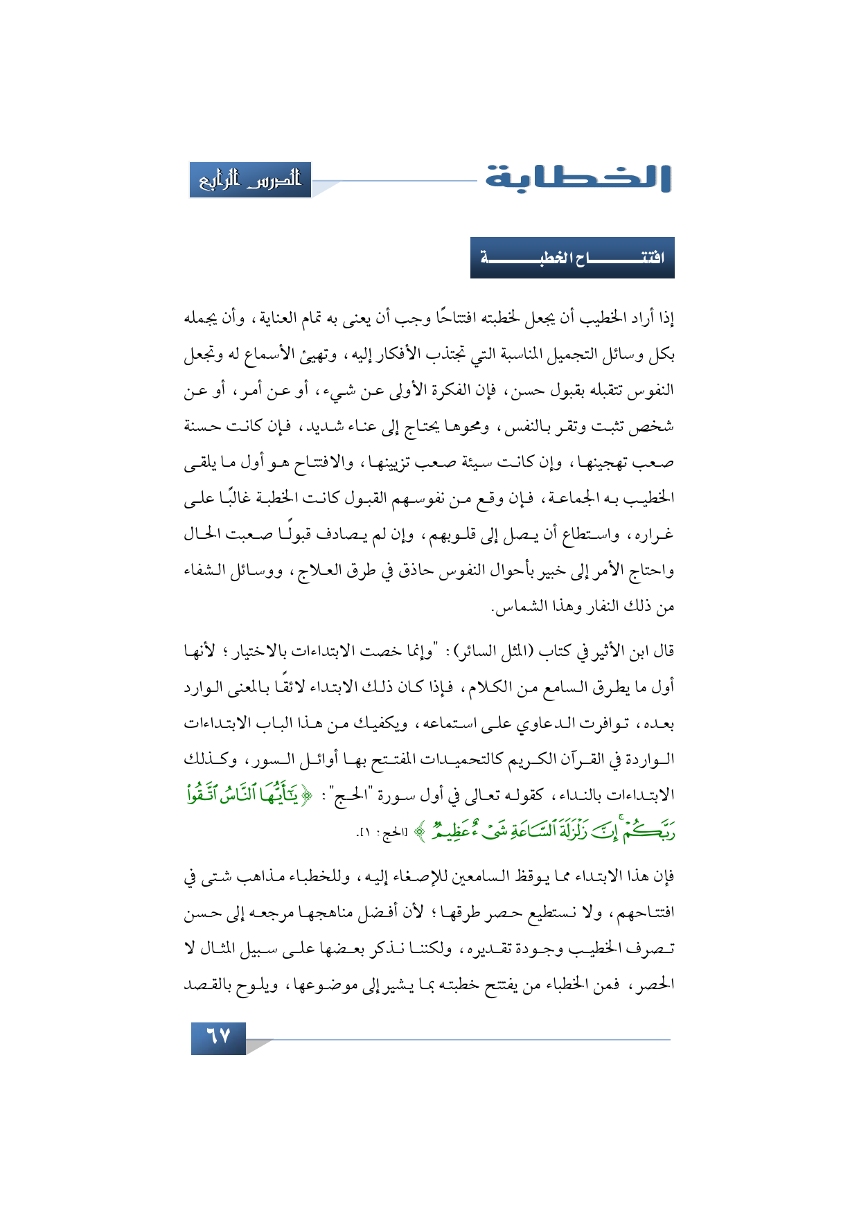 قال ابن الأثير في كتاب (المثل السائر): "وإنما خصت الابتداءات بالاختيار؛ لأنها أول ما يطرق السامع من الكلام، فإذا كان ذلك الابتداء لائقًا بالمعنى الوارد بعده، توافرت الدعاوي على استماعه، ويكفيك من هذا الباب الابتداءات الواردة في القرآن الكريم كالتحميدات المفتتح بها أوائل السور، وكذلك الابتداءات بالنداء كقوله تعالى في أول سورة "الحج": {يَا أَيُّهَا النَّاسُ اتَّقُوا رَبَّكُمْ إِنَّ زَلْزَلَةَ السَّاعَةِ شَيْءٌ عَظِيمٌ} (الحج: 1).