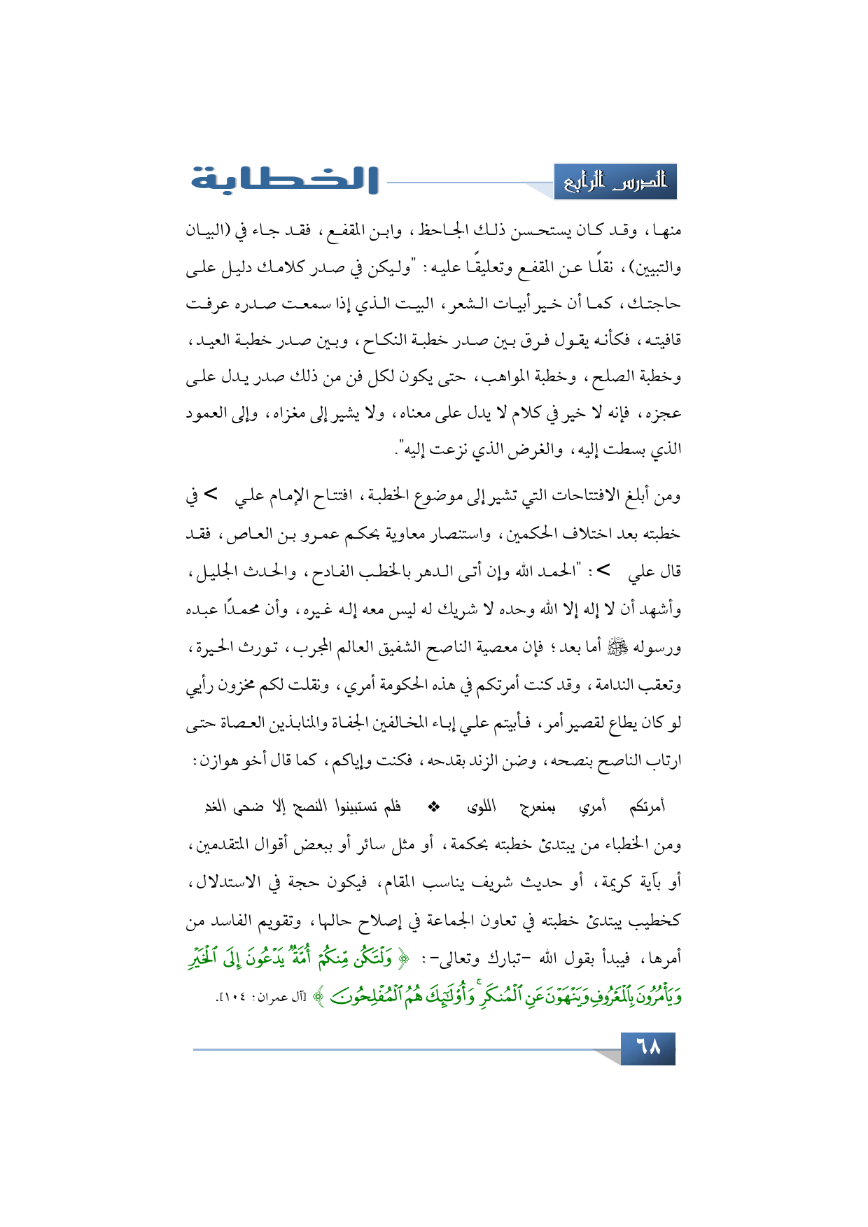ومن الخطباء من يبتدئ خطبته بحكمة أو مثل سائر أو ببعض أقوال المتقدمين أو بآية كريمة أو حديث شريف يناسب المقام، فيكون حجة في الاستدلال كخطيب يبتدئ خطبته في تعاون الجماعة في إصلاح حالها، وتقويم الفاسد من أمرها، فيبدأ بقول الله -تبارك وتعالى-: {وَلْتَكُنْ مِنْكُمْ أُمَّةٌ يَدْعُونَ إِلَى الْخَيْرِ وَيَأْمُرُونَ بِالْمَعْرُوفِ وَيَنْهَوْنَ عَنِ الْمُنْكَرِ وَأُولَئِكَ هُمُ الْمُفْلِحُونَ} (آل عمران: 104).