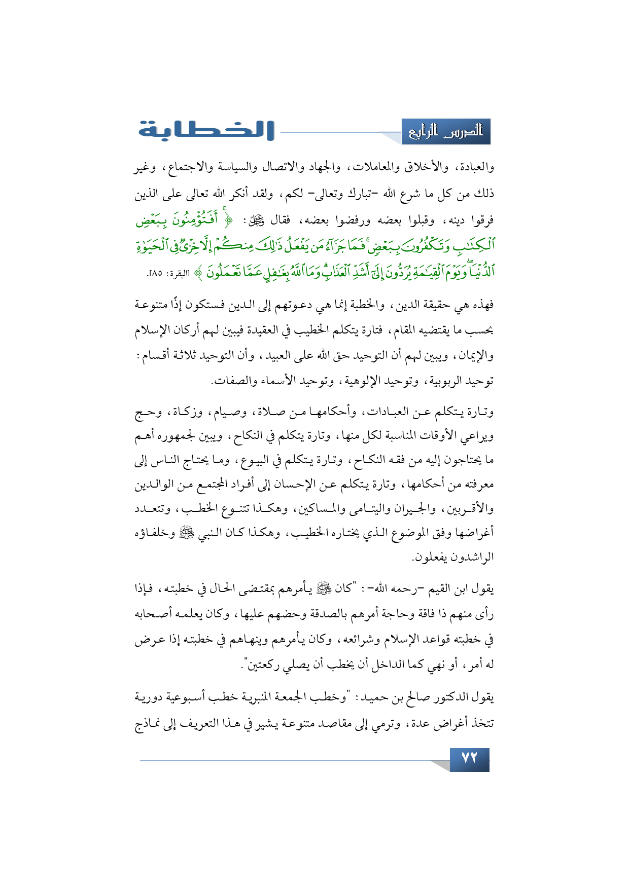 والعبادة، والأخلاق والمعاملات، والجهاد والاتصال والسياسة والاجتماع، وغير ذلك من كل ما شرع الله -تبارك وتعالى- لكم، ولقد أنكر الله تعالى على الذين فرقوا دينه، وقبلوا بعضه ورفضوا بعضه، فقال -عز وجل-: {أَفَتُؤْمِنُونَ بِبَعْضِ الْكِتَابِ وَتَكْفُرُونَ بِبَعْضٍ فَمَا جَزَاءُ مَنْ يَفْعَلُ ذَلِكَ مِنْكُمْ إِلَّا خِزْيٌ فِي الْحَيَاةِ الدُّنْيَا وَيَوْمَ الْقِيَامَةِ يُرَدُّونَ إِلَى أَشَدِّ الْعَذَابِ وَمَا اللَّهُ بِغَافِلٍ عَمَّا تَعْمَلُونَ} (البقرة: 85).