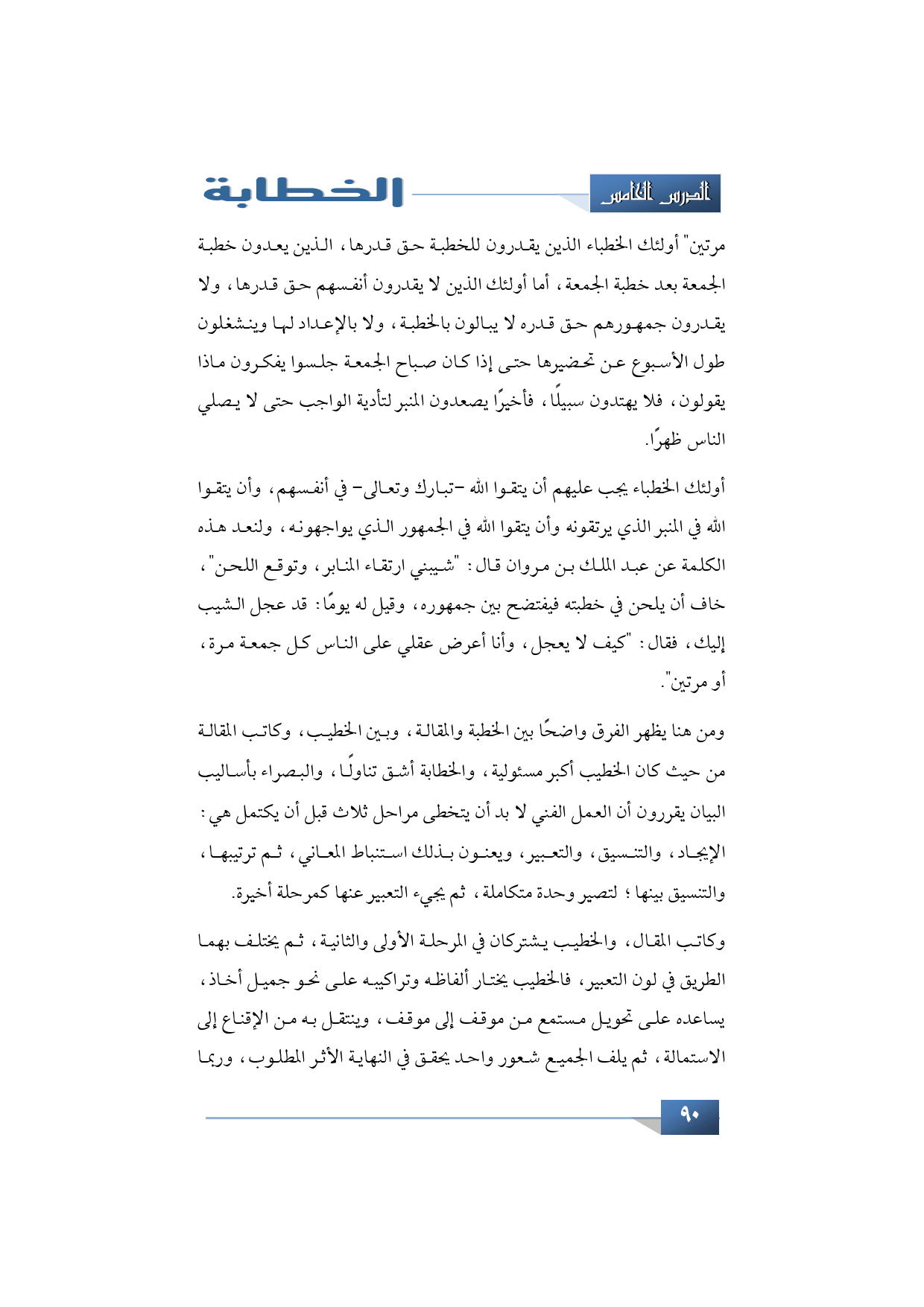 ومن هنا يظهر الفرق واضحًا بين الخطبة والمقالة وبين الخطيب، وكاتب المقالة من حيث كان الخطيب أكبر مسئولية، والخطابة أشق تناولًا، والبصراء بأساليب البيان يقررون أن العمل الفني لا بد أن يتخطى مراحل ثلاث قبل أن يكتمل هي الإيجاد، والتنسيق، والتعبير يعنون بذلك استنباط المعاني، ثم ترتيبها، والتنسيق بينها لتصير وحدة متكاملة ثم يجيء التعبير عنها كمرحلة أخيرة.