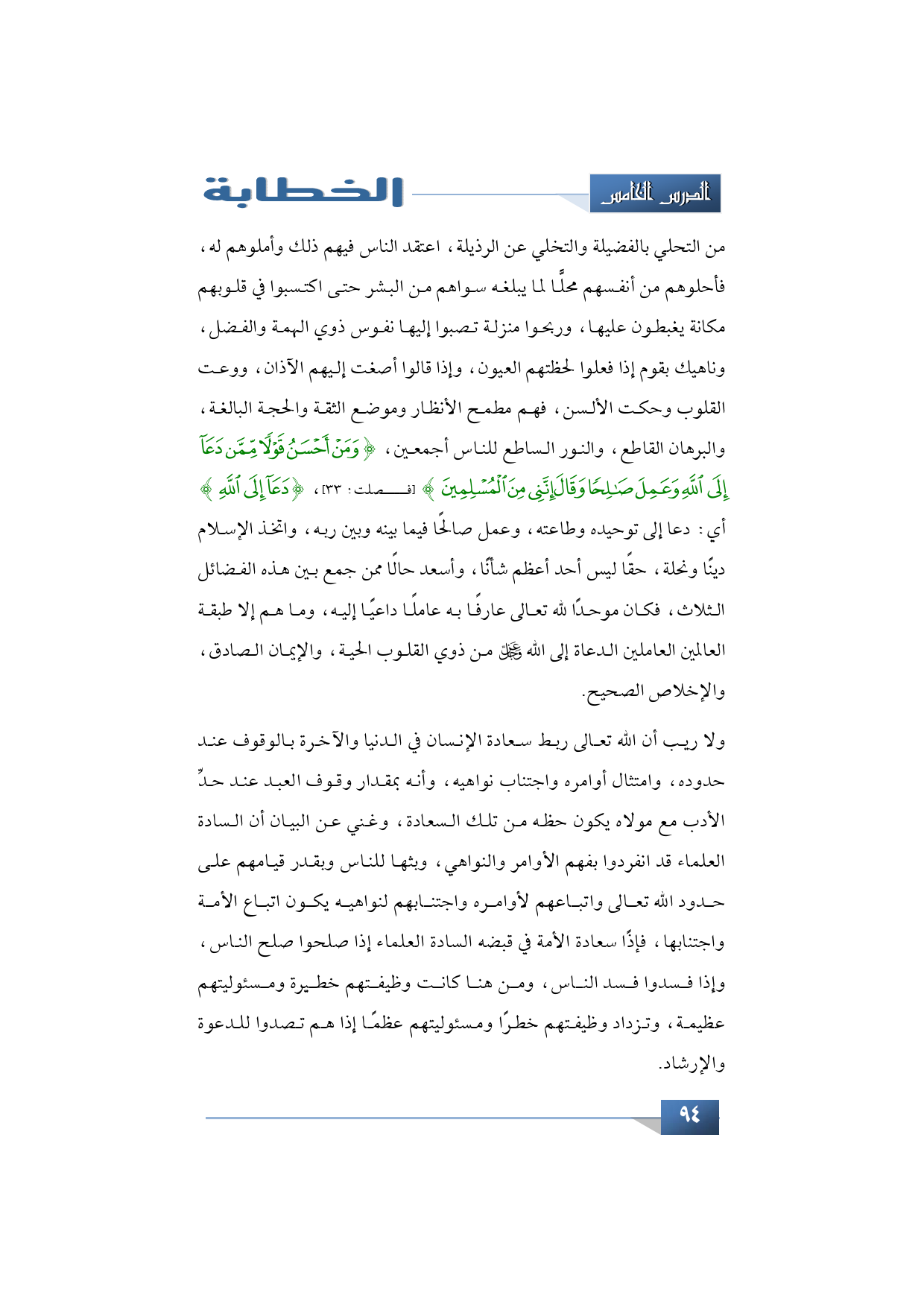 من التحلي بالفضيلة والتخلي عن الرذيلة، اعتقد الناس فيهم ذلك وأملوهم له، فأحلوهم من أنفسهم محلًّا لما يبلغه سواهم من البشر حتى اكتسبوا في قلوبهم مكانة يغبطون عليها، وربحوا منزلة تصبوا إليها نفوس ذوي الهمة والفضل، وناهيك بقوم إذا فعلوا لحظتهم العيون، وإذا قالوا أصغت إليهم الآذان، ووعت القلوب وحكت الألسن، فهم مطمح الأنظار وموضع الثقة والحجة البالغة، والبرهان القاطع، والنور الساطع للناس أجمعين، {وَمَنْ أَحْسَنُ قَوْلًا مِمَّنْ دَعَا إِلَى اللَّهِ وَعَمِلَ صَالِحًا وَقَالَ إِنَّنِي مِنَ الْمُسْلِمِينَ} (فصلت: 33)، {دَعَا إِلَى اللَّهِ} أي: دعا إلى توحيده وطاعته، وعمل صالحًا فيما بينه وبين ربه، واتخذ الإسلام دينًا ونحلة، حقًا ليس أحد أعظم شأنًا، وأسعد حالًا ممن جمع بين هذه الفضائل الثلاث، فكان موحدًا لله تعالى عارفًا به عاملًا داعيًا إليه، وما هم إلا طبقة العالمين العاملين الدعاة إلى الله عز وجل من ذوي القلوب الحية، والإيمان الصادق، والإخلاص الصحيح.