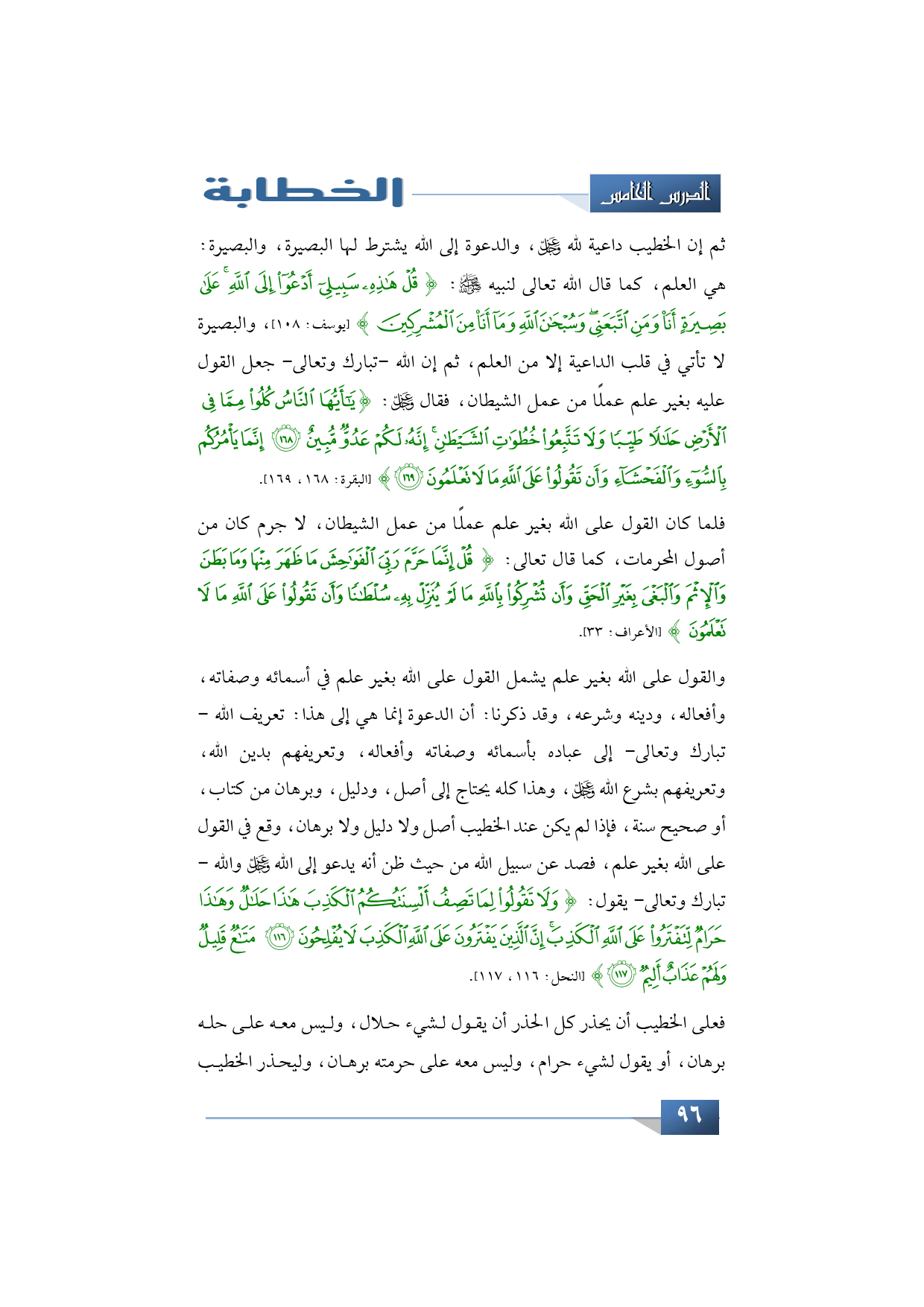 والقول على الله بغير علم يشمل القول على الله بغير علم في أسمائه وصفاته، وأفعاله، ودينه وشرعه، وقد قلنا: أن الدعوة إنما هي إلى هذا، الدعوة هي تعريف الله -تبارك وتعالى- إلى عباده بأسمائه وصفاته وأفعاله، تعريفهم بدين الله، تعريفهم بشرع الله عز وجل، وهذا كله يحتاج إلى أصل، ودليل، وبرهان من كتاب أو صحيح سنة، فإذا لم يكن عند الخطيب أصل ولا دليل ولا برهان، وقع في القول على الله بغير علم، فصد عن سبيل الله من حيث ظن أنه يدعو إلى الله -عز وجل- والله -تبارك وتعالى- يقول: {وَلَا تَقُولُوا لِمَا تَصِفُ أَلْسِنَتُكُمُ الْكَذِبَ هَذَا حَلَالٌ وَهَذَا حَرَامٌ لِتَفْتَرُوا عَلَى اللَّهِ الْكَذِبَ إِنَّ الَّذِينَ يَفْتَرُونَ عَلَى اللَّهِ الْكَذِبَ لَا يُفْلِحُونَ * مَتَاعٌ قَلِيلٌ وَلَهُمْ عَذَابٌ أَلِيمٌ} (النحل: 116، 117).