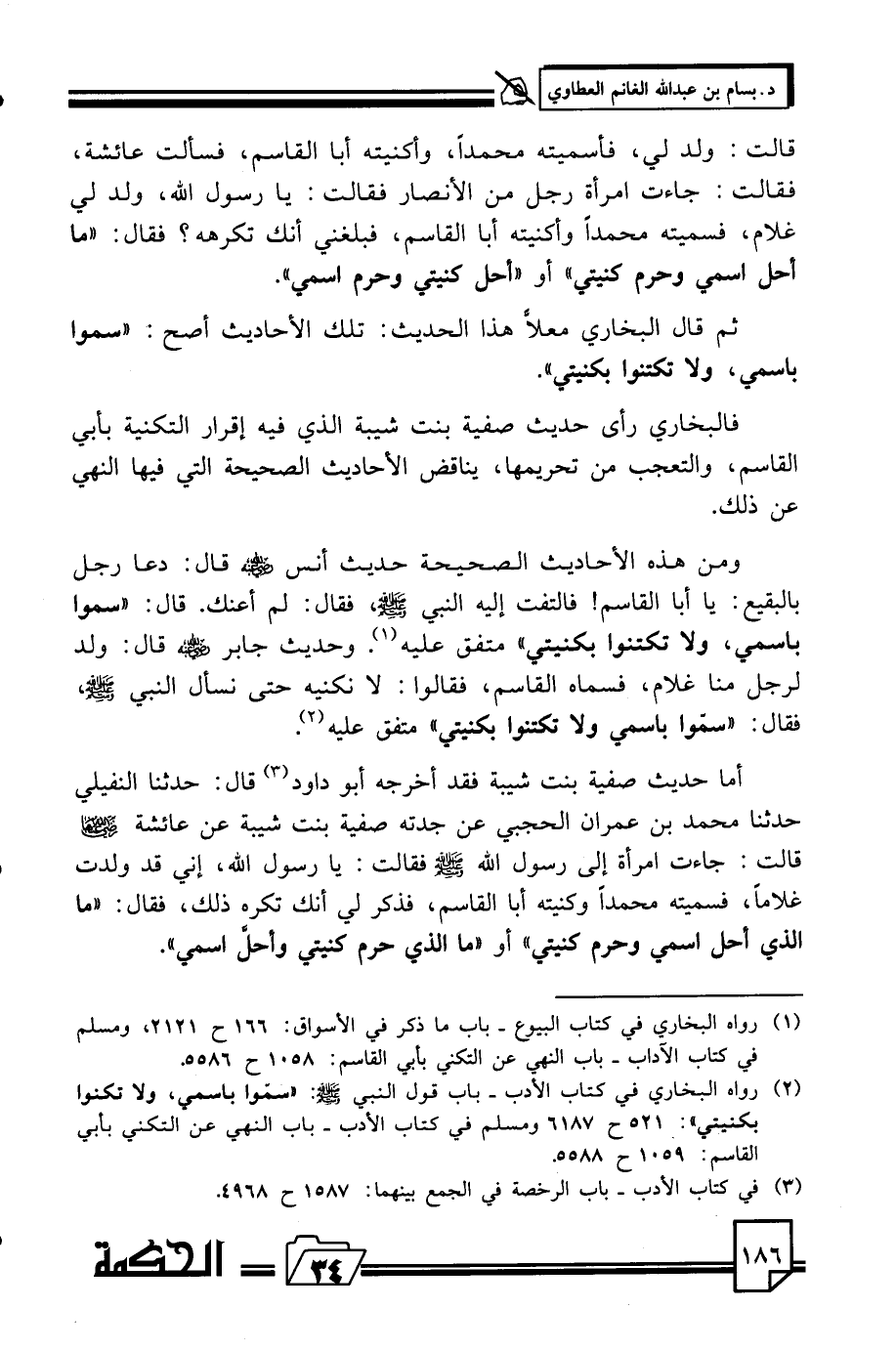 أما حديث صفية بنت شيبة فقد أخرجه أبو داود (¬3) قال: حدثنا النفيلي حدثنا محمد بن عمران الحجبي عن جدته صفية بنت شيبة عن عائشة رضي الله عنها قالت: جاءت امرأة إلي رسول الله صلي الله عليه وسلم فقالت: يا رسول الله، إني قد ولدت غلاما، فسميته محمدا وكنيته أبا القاسم، فذكر لي أنك تكره ذلك، فقال: «ما الذي أحل اسمي وحرم كنيتي» أو «ما الذي حرم كنيتي وأحلّ اسمي».