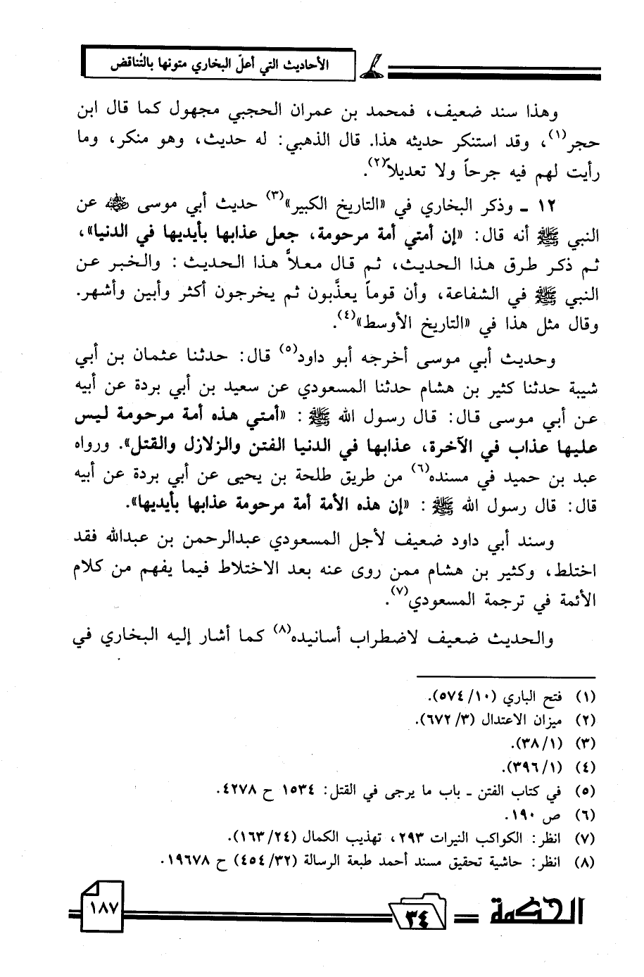12 - وذكر البخاري في «التاريخ الكبير» (¬3) حديث أبي موسي رضي الله عنه عن النبي صلي الله عليه وسلم أنه قال: «إن أمتي أمة مرحومة، جعل عذابها بأيديها في الدنيا»، ثم ذكر طرق هذا الحديث، ثم قال معلاّ هذا الحديث: والخبر عن النبي صلي الله عليه وسلم في الشفاعة، وأن قوما يعذّبون ثم يخرجون أكثر وأبين وأشهر. وقال مثل هذا في «التاريخ الأوسط» (¬4).