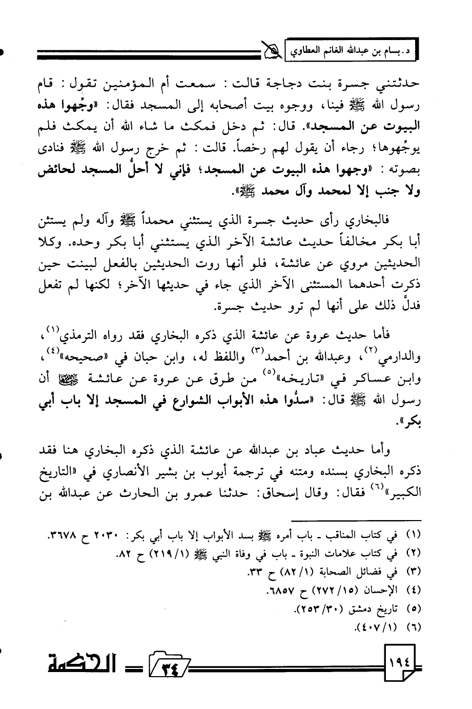 فالبخاري رأي حديث جسرة الذي يستثني محمدا صلي الله عليه وسلم وآله ولم يستثن أبا بكر مخالفا حديث عائشة الآخر الذي يستثني أبا بكر وحده. وكلا الحديثين مروي عن عائشة، فلو أنها روت الحديثين بالفعل لبينت حين ذكرت أحدهما المستثني الآخر الذي جاء في حديثها الآخر؛ لكنها لم تفعل فدلّ ذلك علي أنها لم ترو حديث جسرة.