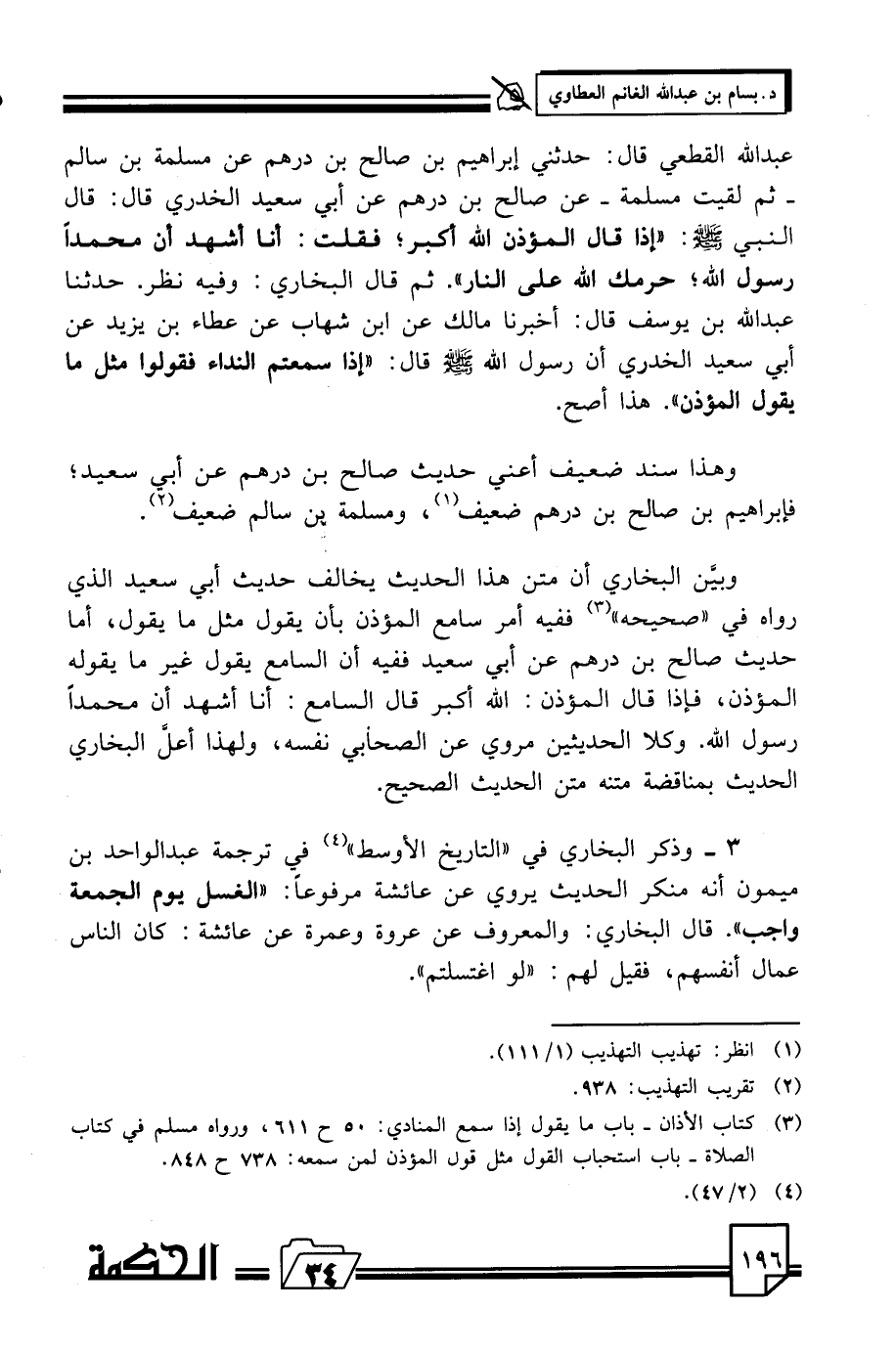 وبيّن البخاري أن متن هذا الحديث يخالف حديث أبي سعيد الذي رواه في «صحيحه» (¬3) ففيه أمر سامع المؤذن بأن يقول مثل ما يقول، أما حديث صالح بن درهم عن أبي سعيد ففيه أن السامع يقول غير ما يقوله المؤذن، فإذا قال المؤذن: الله أكبر قال السامع: أنا أشهد أن محمدًا رسول الله. وكلا الحديثين مروي عن الصحابي نفسه، ولهذا أعلّ البخاري الحديث بمناقضة متنه متن الحديث الصحيح.