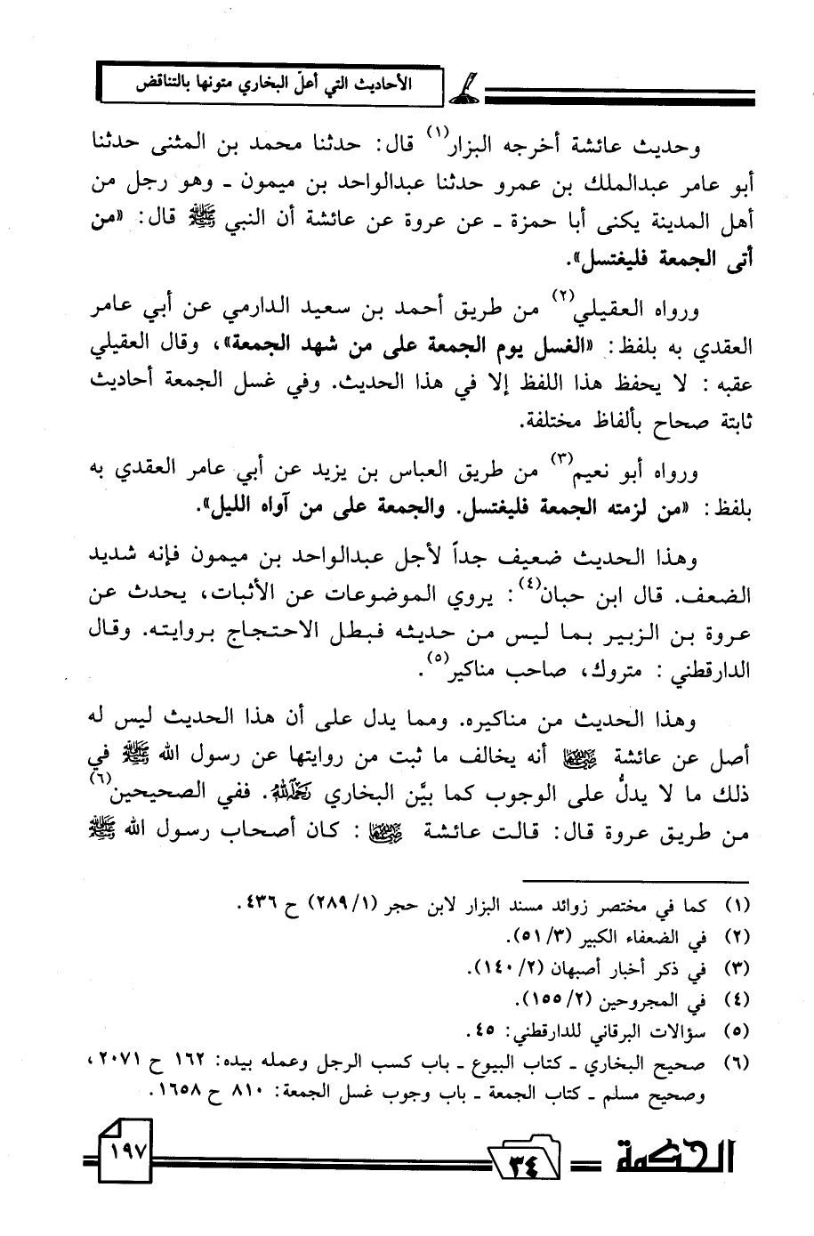 وهذا الحديث من مناكيره. ومما يدل علي أن هذا الحديث ليس له أصل عن عائشة رضي الله عنها أنه يخالف ما ثبت من روايتها عن رسول الله صلي الله عليه وسلم في ذلك ما لا يدلّ علي الوجوب كما بيّن البخاري رحمه الله.