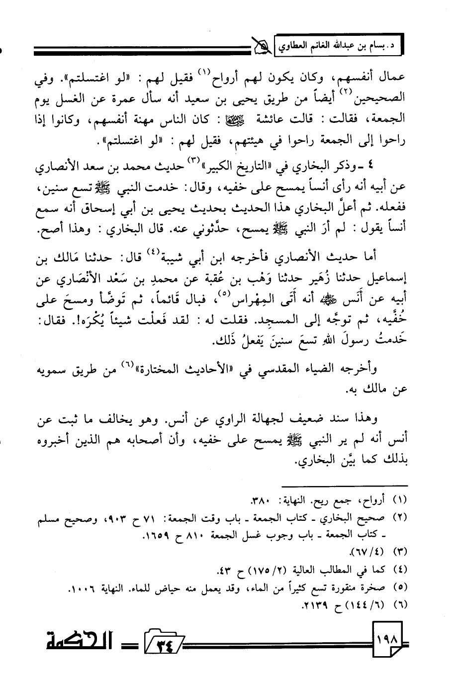 4 - وذكر البخاري في «التاريخ الكبير» (¬3) حديث محمد بن سعد الأنصاري عن أبيه أنه رأي أنسا يمسح علي خفيه، وقال: خدمت النبي صلي الله عليه وسلم تسع سنين، ففعله. ثم أعلّ البخاري هذا الحديث بحديث يحيى بن أبي إسحاق أنه سمع أنسا يقول: لم أر النبي صلي الله عليه وسلم يمسح، حدّثوني عنه. قال البخاري: وهذا أصح.