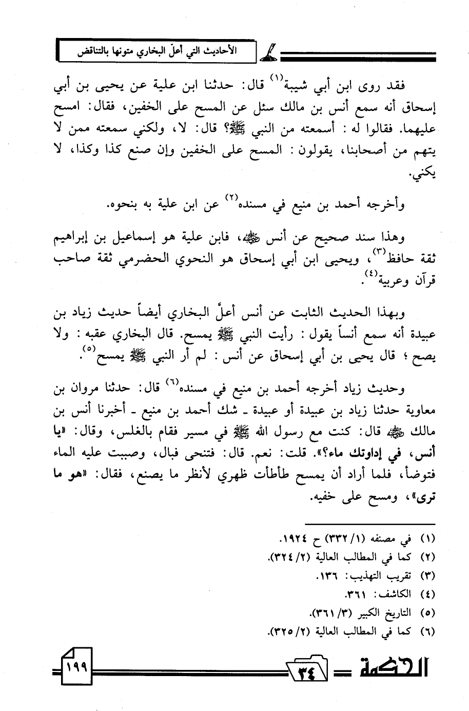 وبهذا الحديث الثابت عن أنس أعلّ البخاري أيضا حديث زياد بن عبيدة أنه سمع أنسا يقول: رأيت النبي صلي الله عليه وسلم يمسح. قال البخاري عقبه: ولا يصح؛ قال يحيى بن أبي إسحاق عن أنس: لم أر النبي صلي الله عليه وسلم يمسح (¬5).