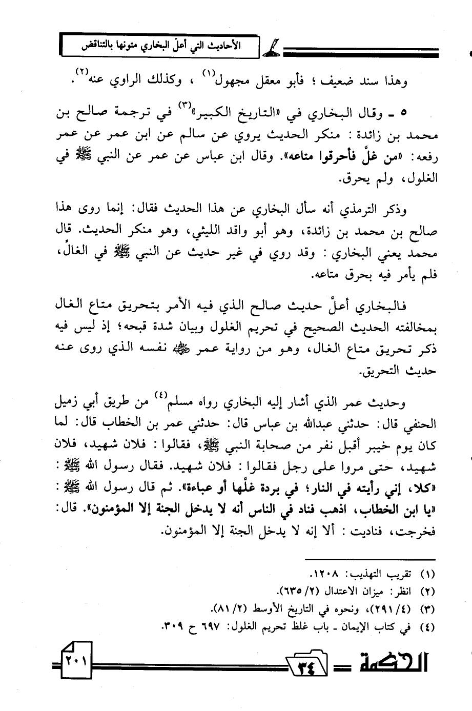 فالبخاري أعلّ حديث صالح الذي فيه الأمر بتحريق الغال بمخالفته الحديث الصحيح في تحريم الغلول وبيان شدة قبحه؛ إذ ليس فيه ذكر تحريق متاع الغال، وهو من رواية عمر رضي الله عنه نفسه الذي روي عنه حديث التحريق.
