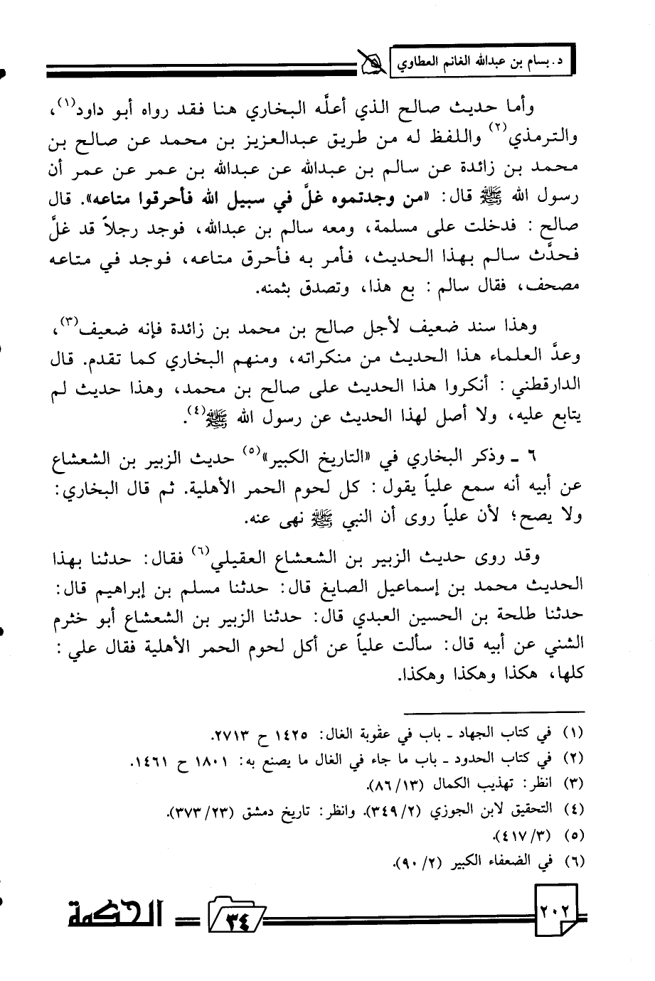 وأما حديث صالح الذي أعلّه البخاري هنا فقد رواه أبو داود (¬1)، والترمذي (¬2) واللفظ له من طريق عبد العزيز بن محمد عن صالح بن محمد بن زائدة عن سالم بن عبد الله عن عبد الله بن عمر عن عمر أن رسول الله صلي الله عليه وسلم قال: «من وجدتموه غلّ في سبيل الله فأحرقوا متاعه». قال صالح: فدخلت علي مسلمة، ومعه سالم بن عبد الله، فوجد رجلا قد غلّ فحدّث سالم بهذا الحديث، فأمر به فأحرق متاعه، فوجد في متاعه مصحف، فقال سالم: بع هذا، وتصدق بثمنه.