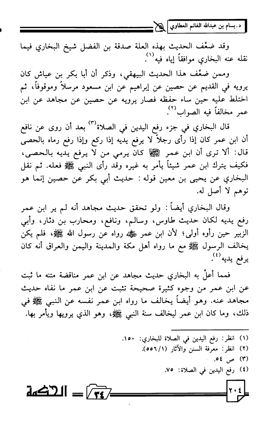 قال البخاري في جزء رفع اليدين في الصلاة (¬3) بعد أن روى عن نافع أن ابن عمر كان إذا رأي رجلا لا يرفع يديه إذا ركع وإذا رفع رماه بالحصي قال: ألا تري أن ابن عمر رضي الله عنهما كان يرمي من لا يرفع يديه بالحصي، فكيف يترك ابن عمر شيئا يأمر به غيره وقد رأي النبي صلي الله عليه وسلم فعله. ثم نقل البخاري عن يحيى بن معين قوله: حديث أبي بكر عن حصين إنما هو توهم لا أصل له.