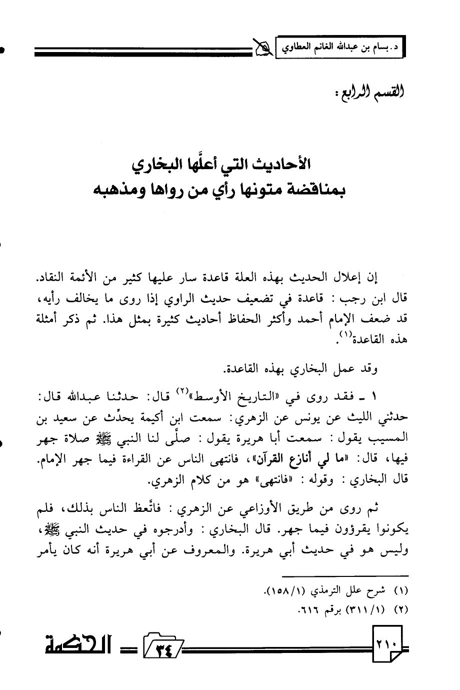القسم الرابع: الأحاديث التي أعلّها البخاري بمناقضة متوناه رأي من رواها ومذهبه