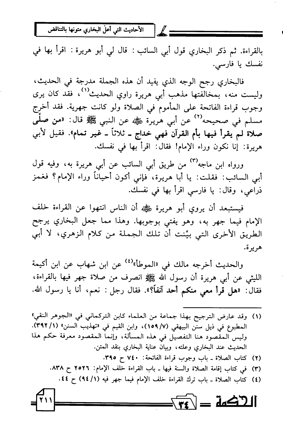 (¬4) كتاب الصلاة - باب ترك القراءة خلف الإمام فيما جهر فيه (1/ 94) ح 44.