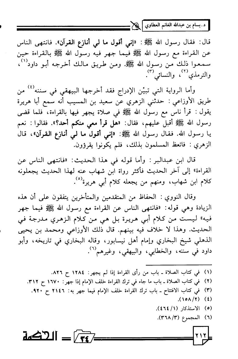 وقال النووي: الحفاظ من المتقدمين والمتأخرين يتفقون علي أن هذه الزيادة وهي قوله: «فانتهي الناس عن القراءة مع رسول الله صلي الله عليه وسلم فيما جهر فيه» ليست من كلام أبي هريرة بل هي من كلام الزهري مدرجة في الحديث. وهذا لا خلاف فيه بينهم. قال ذلك الأوزاعي ومحمد بن يحيى الذهلي شيخ البخاري وإمام أهل نيسابور، وقاله البخاري في تاريخه، وأبو داود في سننه، والخطابي، والبيهقي، وغير هم (¬6).