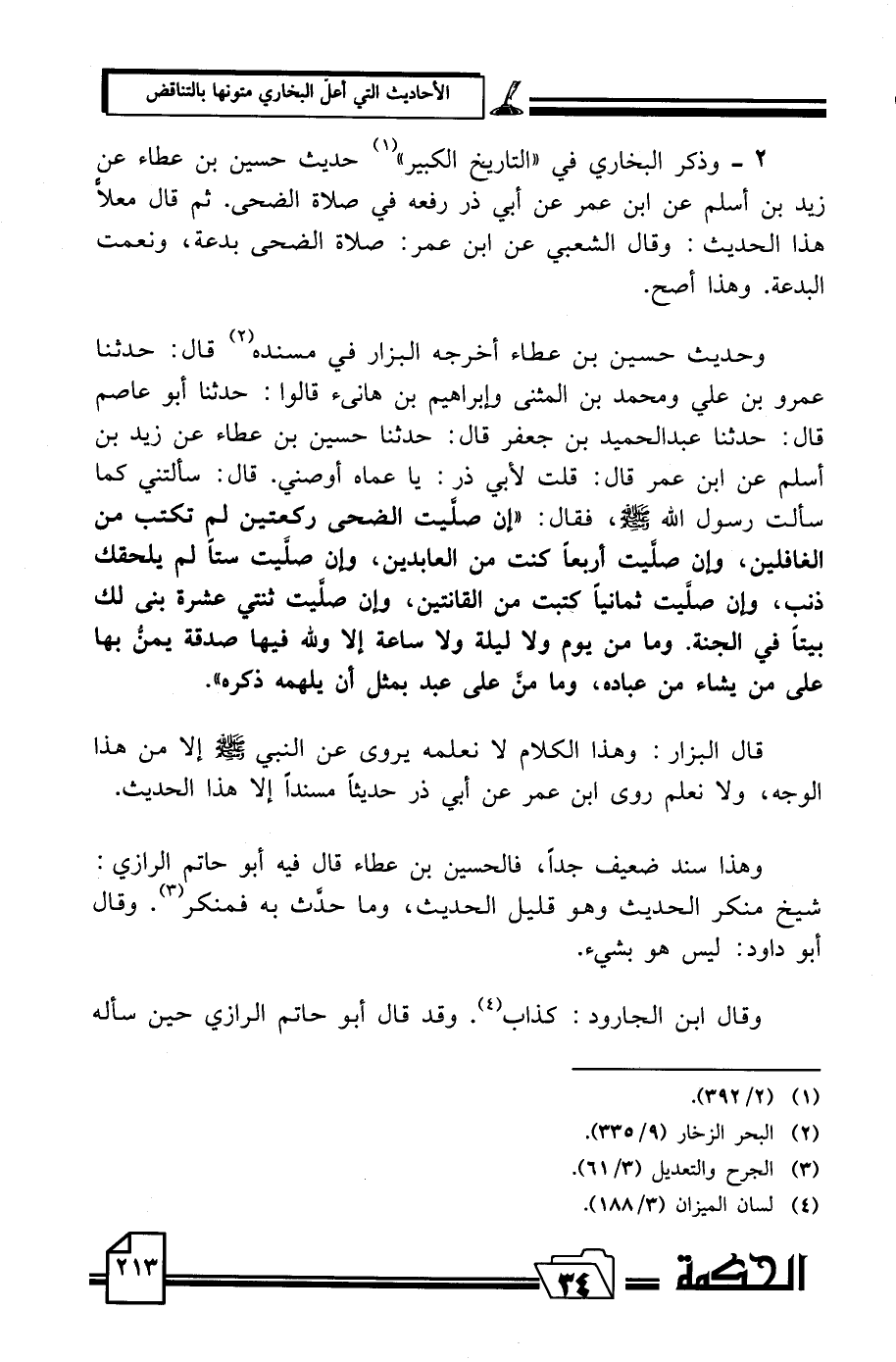 2 - وذكر البخاري في «التاريخ الكبير» (¬1) حديث حسين بن عطاء عن زيد بن أسلم عن ابن عمر عن أبي ذر رفعه في صلاة الضحي. ثم قال معلاّ هذا الحديث: وقال الشعبي عن ابن عمر: صلاة الضحى بدعة، ونعمت البدعة. وهذا أصح.
