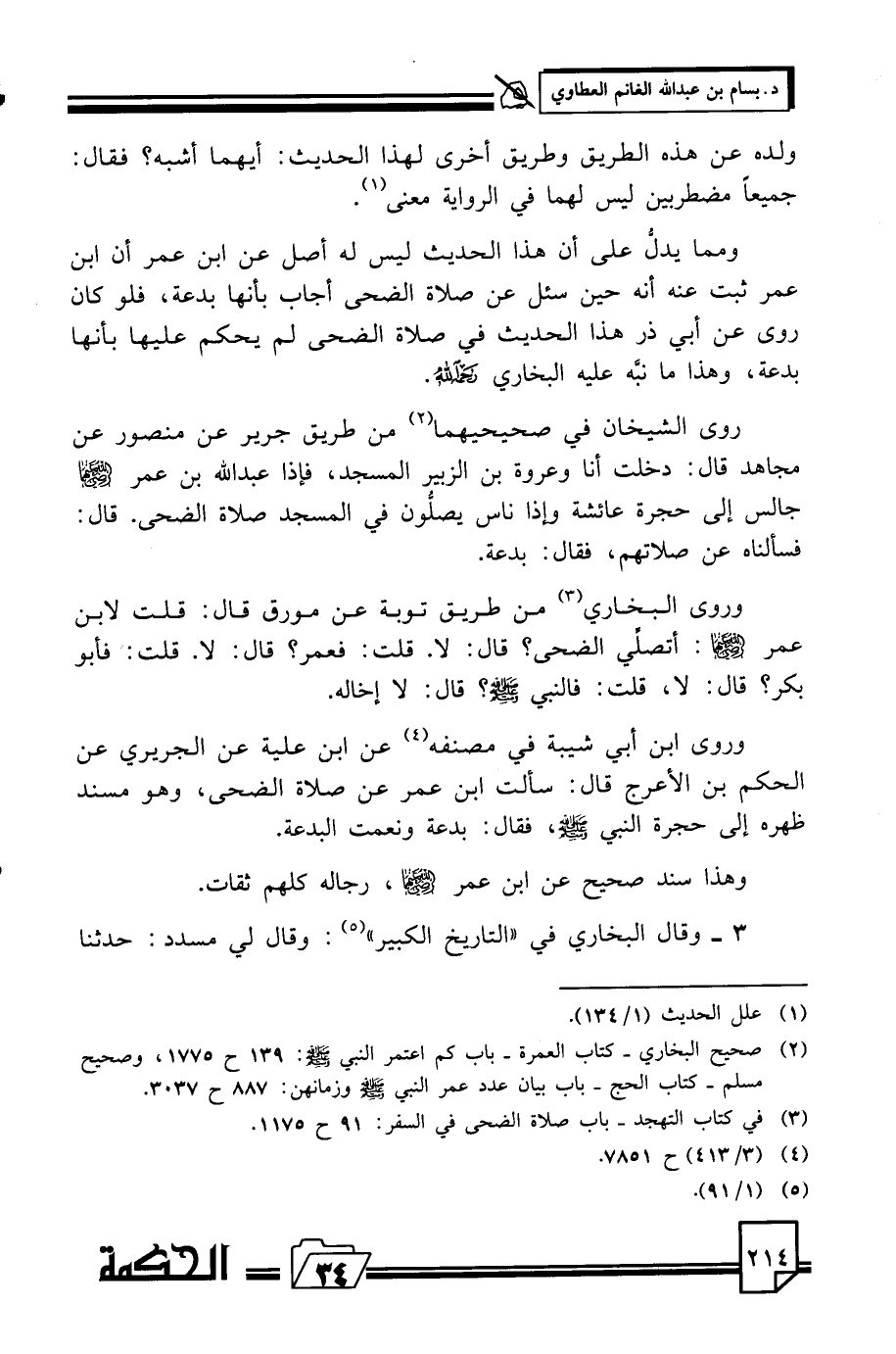 وروى ابن أبي شيبة في مصنفه (¬4) عن ابن علية عن الجريري عن الحكم بن الأعرج قال: سألت ابن عمر عن صلاة الضحى، وهو مسند ظهره إلي حجرة النبي صلي الله عليه وسلم، فقال: بدعة ونعمت البدعة.