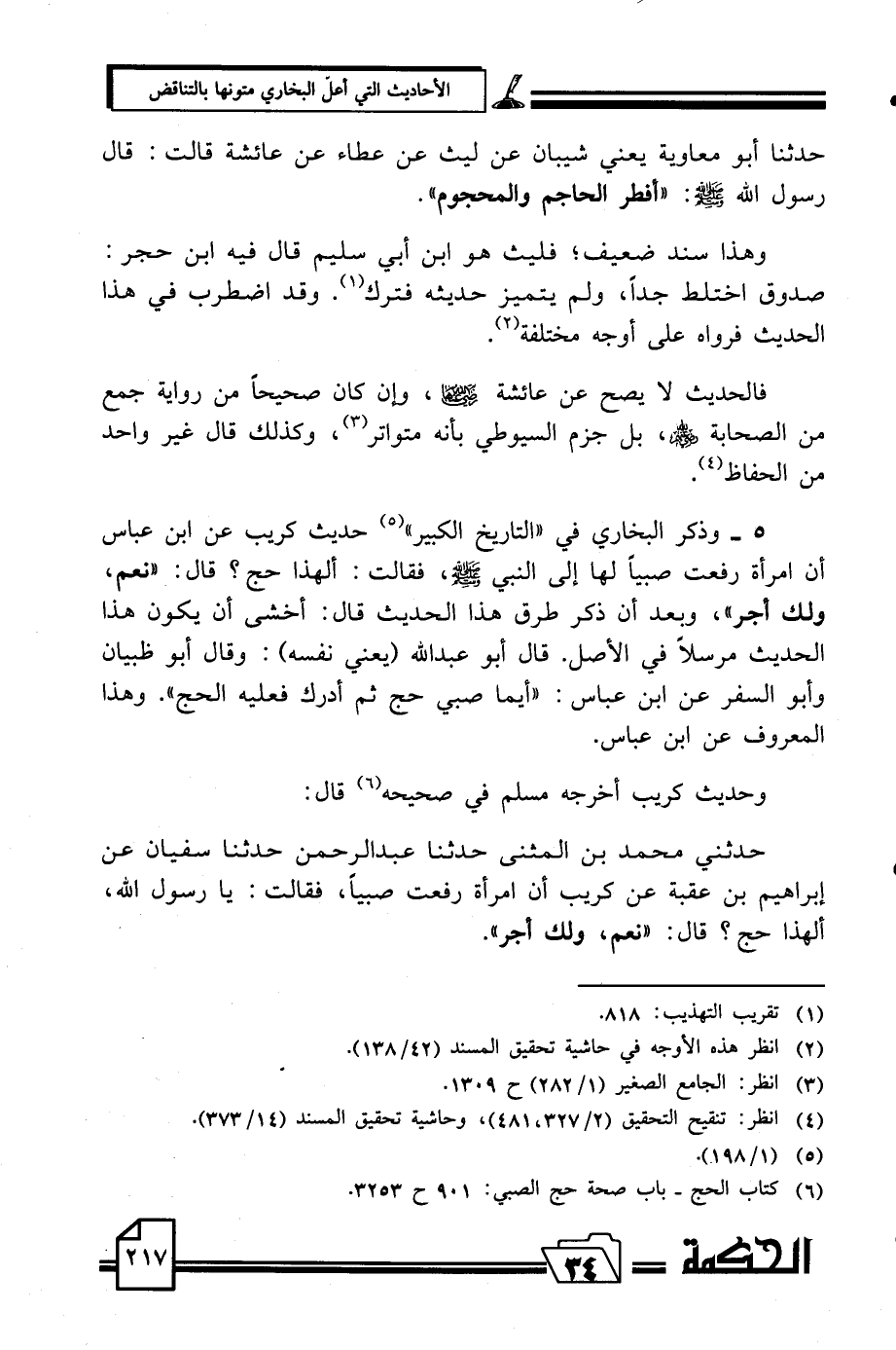 5 - وذكر البخاري في «التاريخ الكبير» (¬5) حديث كريب عن ابن عباس أن امرأة رفعت صبيا لها إلي النبي صلي الله عليه وسلم، فقالت: ألهذا حج؟ قال: «نعم، ولك أجر»، وبعد أن ذكر طرق هذا الحديث قال: أخشي أن يكون هذا الحديث مرسلا في الأصل. قال أبو عبد الله (يعني نفسه): وقال أبو ظبيان وأبو السفر عن ابن عباس: «أيما صبي حج ثم أدرك فعليه الحج». وهذا المعروف عن ابن عباس.