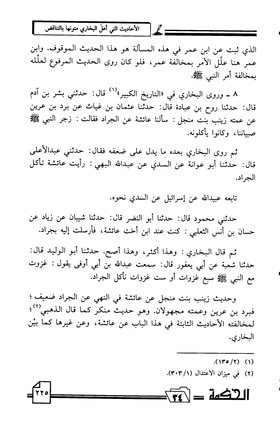 ثم روى البخاري بعده ما يدل علي ضعفه فقال: حدثني عبد الأعلي قال: حدثنا أبو عوانة عن السدي عن عبد الله البهي: رأيت عائشة تأكل الجراد.