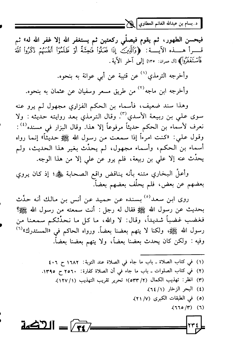 فيحسن الطهور، ثم يقوم فيصلّي ركعتين ثم يستغفر الله إلا غفر الله له» ثم قرأ هذه الآية: {وَالَّذِينَ إِذَا فَعَلُوا فَاحِشَةً أَوْ ظَلَمُوا أَنْفُسَهُمْ ذَكَرُوا اللَّهَ فَاسْتَغْفَرُوا} [آل عمران: 135] إلي آخر الآية.