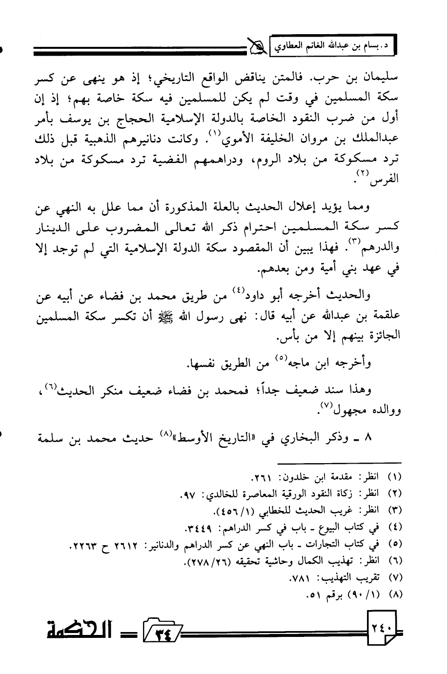 سليمان بن حرب. فالمتن ينقاض الواقع التاريخي؛ إذ هو ينهي عن كسر سكة المسلمين في وقت لم يكن للمسلمين فيه سكة خاصة بهم؛ إذ إن أول من ضرب النقود الخاصة بالدولة الإسلامية الحجاج بن يوسف بأمر عبد الملك بن مروان الخليفة الأموي (¬1). وكانت دنانيرهم الذهبية قبل ذلك ترد مسكوكة من بلاد الروم، ودراهمهم الفضية ترد مسكوكة من بلاد الفرس (¬2).