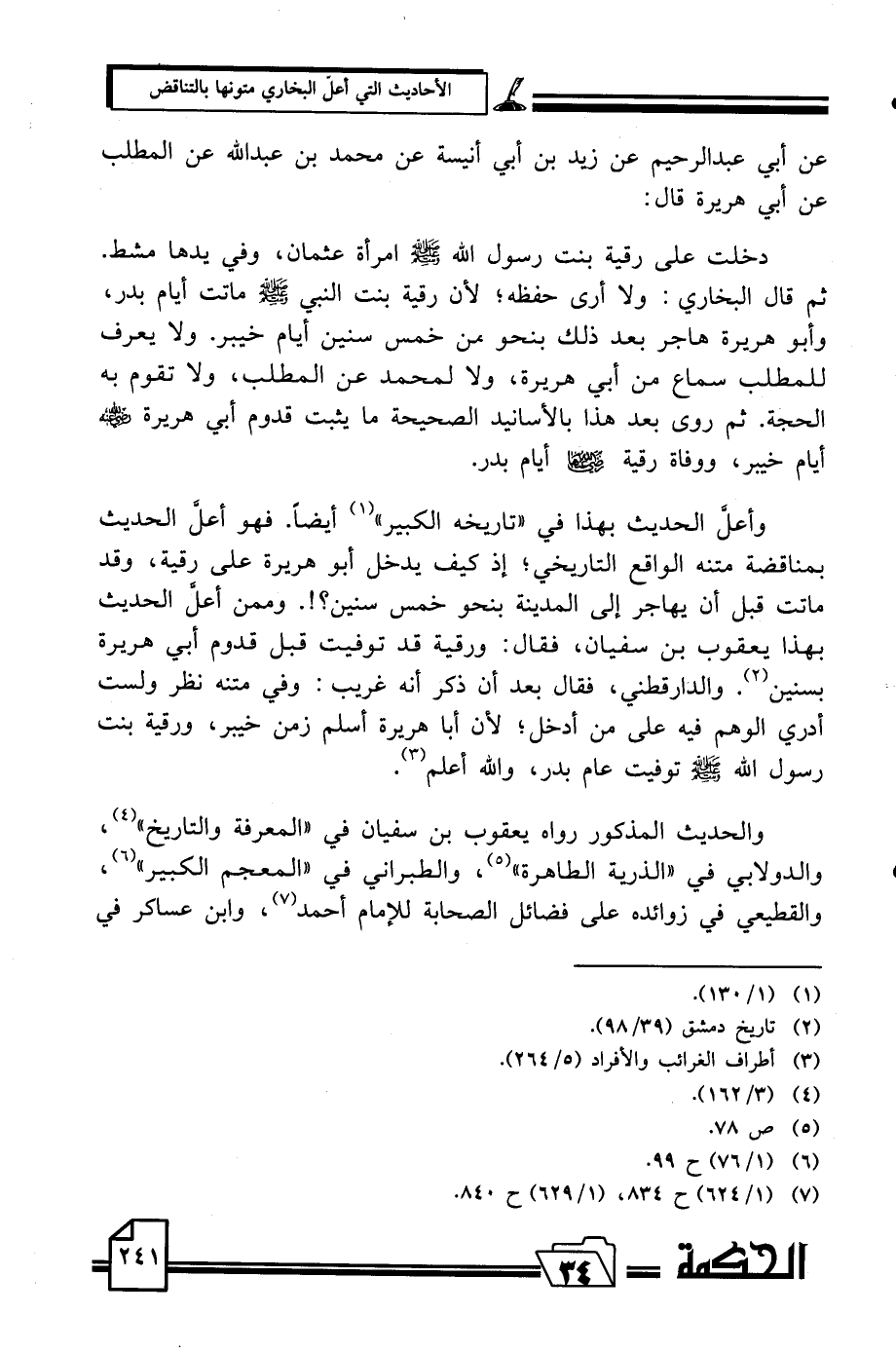 عن أبي عبد الرحيم عن زيد بن أبي أنيسة عن محمد بن عبد الله عن المطلب عن أبي هريرة قال: دخلت علي رقية بنت رسول الله صلي الله عليه وسلم امرأة عثمان، وفي يدها مشط. ثم قال البخاري: ولا أري حفظه؛ لأن رقية بنت النبي صلي الله عليه وسلم ماتت أيام بدر، وأبو هريرة هاجر بعد ذلك بنحو من خمس سنين أيام خيبر. ولا يعرف للمطلب سماع من أبي هريرة، ولا لمحمد عن المطلب، ولا تقوم به الحجة. ثم روى بعد هذا بالأسانيد الصحيحة ما يثبت قدوم أبي هريرة رضي الله عنه أيام خيبر، ووفاة رقية رضي الله عنها أيام بدر.
