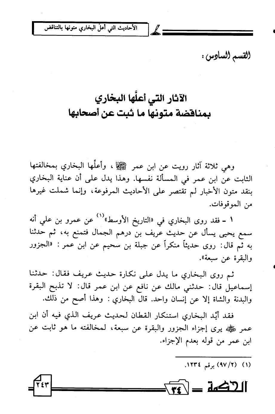 القسم السادس: الآثار التي أعلّها البخاري بمناقضة متونها ما ثبت عن أصحابها
