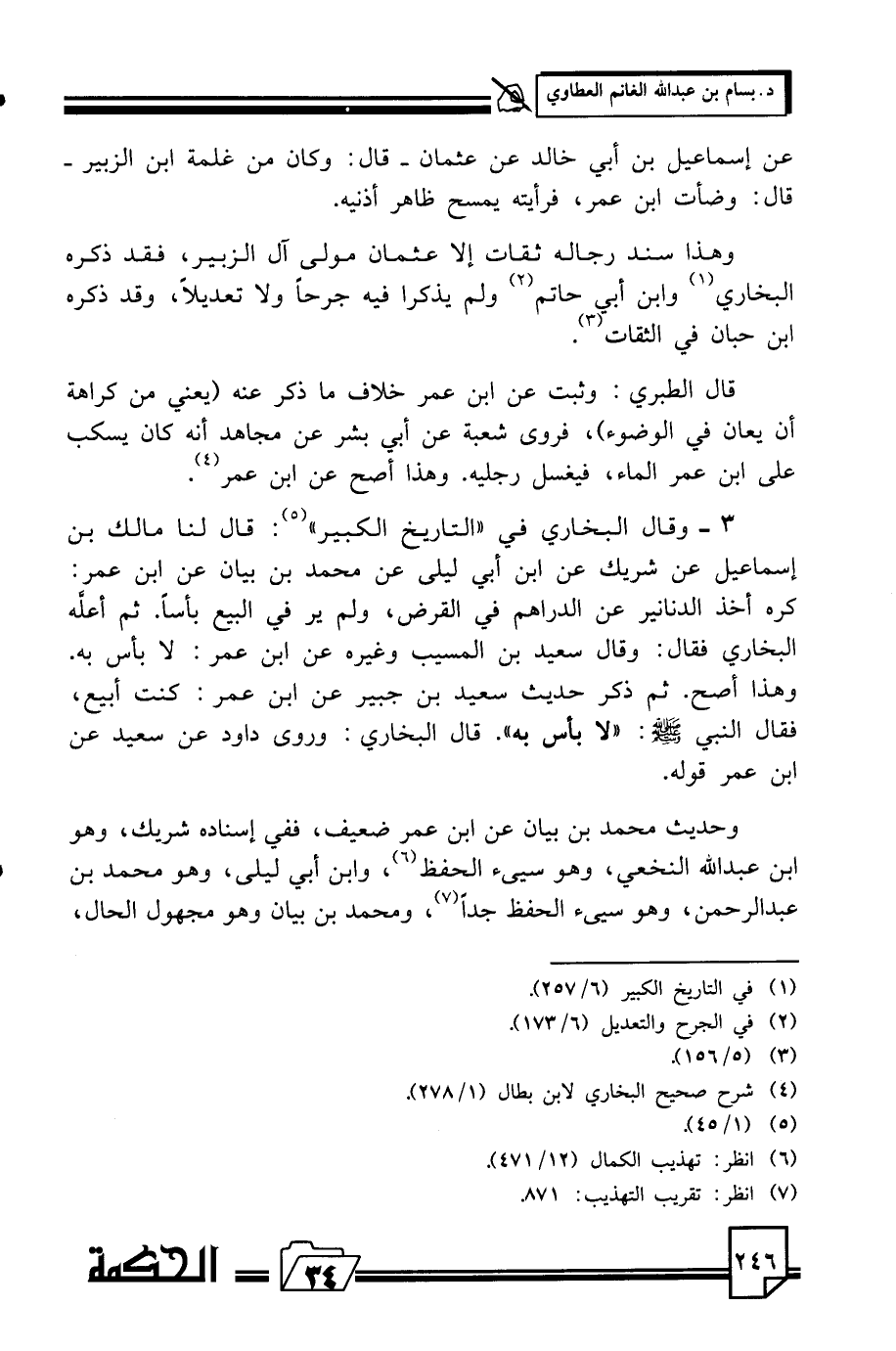 عن إسماعيل بن أبي خالد عن عثمان - قال: وكان من غلمة ابن الزبير - قال: وضأت ابن عمر، فرأيته يمسح ظاهر أذنيه.