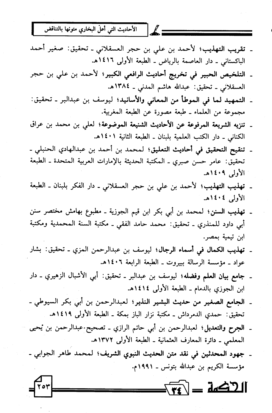 - تنقيح التحقيق في أحاديث التعليق؛ لمحمد بن أحمد بن عبد الهادي الحنبلي - تحقيق: عامر حسن صبري - المكتبة الحديثة بالإمارات العربية المتحدة - الطبعة الأولى 1409 هـ.