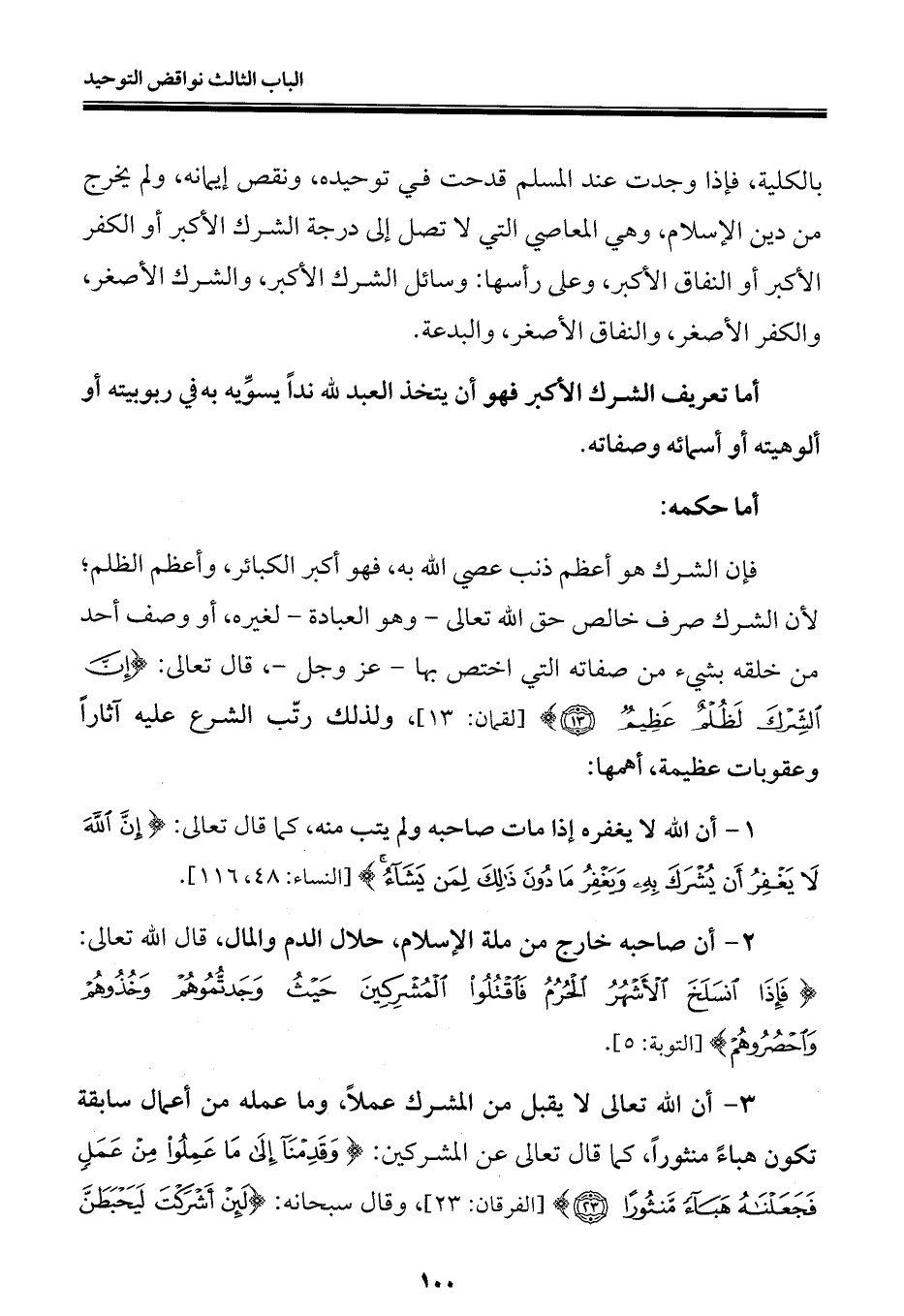 أما تعريف الشرك الأكبر فهو أن يتخذ العبد لله ندًا يسوِّيه به في ربوبيته أو ألوهيته أو أسمائه وصفاته.