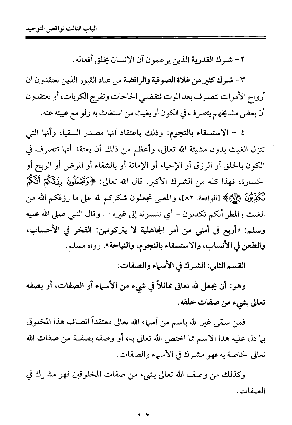 ٤ - الاستسقاء بالنجوم: وذلك باعتقاد أنها مصدر السقيا، وأنها التي تنزل الغيث بدون مشيئة الله تعالى، وأعظم من ذلك أن يعتقد أنها تتصرف في الكون بالخلق أو الرزق أو الإحياء أو الإماتة أو بالشفاء أو المرض أو الربح أو الخسارة، فهذا كله من الشرك الأكبر. قال الله تعالى: {وَتَجْعَلُونَ رِزْقَكُمْ أَنَّكُمْ تُكَذِّبُونَ (٨٢)} [الواقعة: ٨٢]، والمعنى تجعلون شكركم لله على ما رزقكم الله من الغيث والمطر أنكم تكذبون - أي تنسبونه إلى غيره -. وقال النبي صلى الله عليه وسلم: "أربع في أمتي من أمر الجاهلية لا يتركونهن: الفخر في الأحساب، والطعن في الأنساب، والاستسقاء بالنجوم، والنياحة". رواه مسلم.