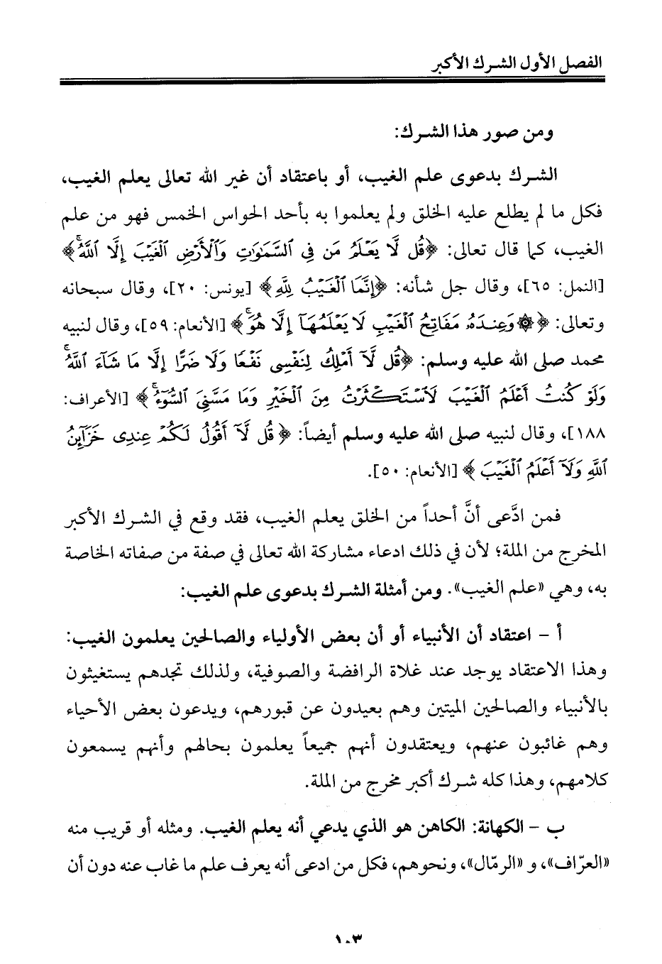 الشرك بدعوى علم الغيب، أو باعتقاد أن غير الله تعالى يعلم الغيب، فكل ما لم يطلع عليه الخلق ولم يعلموا به بأحد الحواس الخمس فهو من علم الغيب، كما قال تعالى: {قُلْ لَا يَعْلَمُ مَنْ فِي السَّمَاوَاتِ وَالْأَرْضِ الْغَيْبَ إِلَّا اللَّهُ} [النمل: ٦٥]، وقال جل شأنه: {إِنَّمَا الْغَيْبُ لِلَّهِ} [يونس: ٢٠]، وقال سبحانه وتعالى: {وَعِنْدَهُ مَفَاتِحُ الْغَيْبِ لَا يَعْلَمُهَا إِلَّا هُوَ} [الأنعام: ٥٩]، وقال لنبيه محمد صلى الله عليه وسلم: {قُلْ لَا أَمْلِكُ لِنَفْسِي نَفْعًا وَلَا ضَرًّا إِلَّا مَا شَاءَ اللَّهُ وَلَوْ كُنْتُ أَعْلَمُ الْغَيْبَ لَاسْتَكْثَرْتُ مِنَ الْخَيْرِ وَمَا مَسَّنِيَ السُّوءُ} [الأعراف: ١٨٨]، وقال لنبيه صلى الله عليه وسلم أيضًا: {قُلْ لَا أَقُولُ لَكُمْ عِنْدِي خَزَائِنُ اللَّهِ وَلَا أَعْلَمُ الْغَيْبَ} [الأنعام: ٥٠].