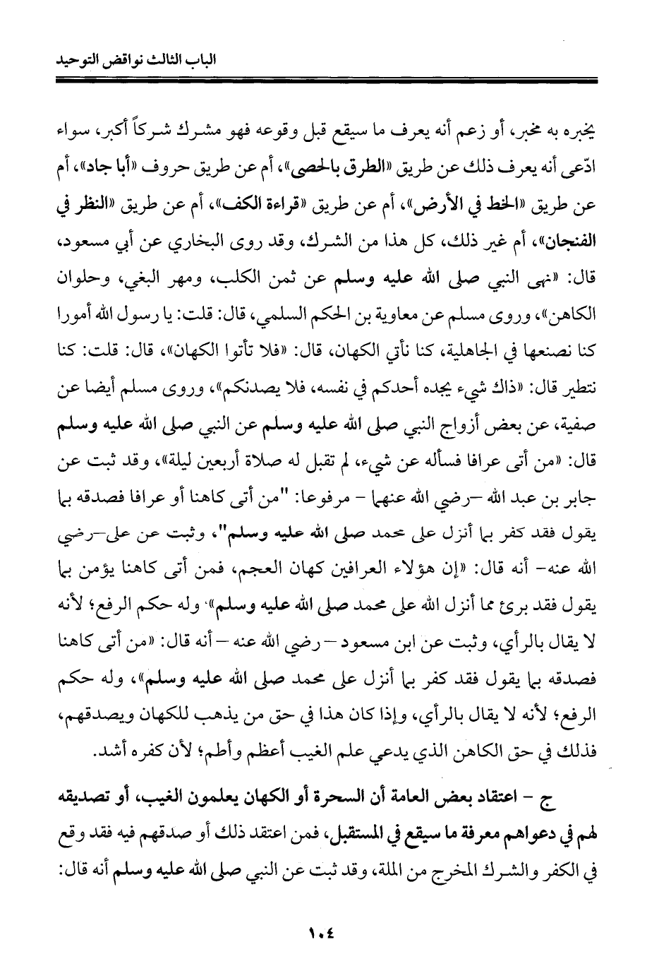 يخبره به مخبر، أو زعم أنه يعرف ما سيقع قبل وقوعه فهو مشرك شركًا أكبر، سواء ادّعى أنه يعرف ذلك عن طريق "الطرق بالحصى"، أم عن طريق حروف "أبا جاد"، أم عن طريق "الخط في الأرض"، أم عن طريق "قراءة الكف"، أم عن طريق "النظر في الفنجان"، أم غير ذلك، كل هذا من الشرك، وقد روى البخاري عن أبي مسعود، قال: "نهى النبي صلى الله عليه وسلم عن ثمن الكلب، ومهر البغي، وحلوان الكاهن"، وروى مسلم عن معاوية بن الحكم السلمي، قال: قلت: يا رسول الله أمورا كنا نصنعها في الجاهلية، كنا نأتي الكهان، قال: "فلا تأتوا الكهان"، قال: قلت: كنا نتطير قال: "ذاك شيء يجده أحدكم في نفسه، فلا يصدنكم"، وروى مسلم أيضا عن صفية، عن بعض أزواج النبي صلى الله عليه وسلم عن النبي صلى الله عليه وسلم قال: "من أتى عرافا فسأله عن شيء، لم تقبل له صلاة أربعين ليلة"، وقد ثبت عن جابر بن عبد الله - رضي الله عنهما - مرفوعا: "من أتى كاهنا أو عرافا فصدقه بما يقول فقد كفر بما أنزل على محمد صلى الله عليه وسلم" وثبت عن علي - رضي الله عنه - أنه قال: "إن هؤلاء العرافين كهان العجم، فمن أتى كاهنا يؤمن بما يقول فقد برئ مما أنزل الله على محمد صلى الله عليه وسلم" وله حكم الرفع؛ لأنه لا يقال بالرأي، وثبت عن ابن مسعود - رضي الله عنه - أنه قال: "من أتى كاهنا فصدقه بما يقول فقد كفر بما أنزل على محمد صلى الله عليه وسلم"، وله حكم الرفع؛ لأنه لا يقال بالرأي، وإذا كان هذا في حق من يذهب للكهان ويصدقهم، فذلك في حق الكاهن الذي يدعي علم الغيب أعظم وأطم؛ لأن كفره أشد.