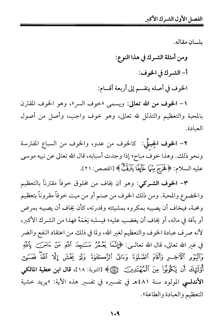 ٣ - الخوف الشركي: وهو أن يخاف من مخلوق خوفًا مقترنًا بالتعظيم والخضوع والمحبة. ومن ذلك الخوف من صنم أو من ميت خوفًا مقرونًا بتعظيم ومحبة، فيخاف أن يصيبه بمكروه بمشيئته وقدرته، كأن يحاف أن يصيبه بمرض أو بآفة في ماله، أو يخاف أن يغضب عليه؛ فيسلبه نِعَمَهُ فهذا من الشرك الأكبر، لأنه صرف عبادة الخوف والتعظيم لغير الله، ولما في ذلك من اعتقاد النفع والضر في غير الله تعالى، قال الله تعالى: {إِنَّمَا يَعْمُرُ مَسَاجِدَ اللَّهِ مَنْ آمَنَ بِاللَّهِ وَالْيَوْمِ الْآخِرِ وَأَقَامَ الصَّلَاةَ وَآتَى الزَّكَاةَ وَلَمْ يَخْشَ إِلَّا اللَّهَ فَعَسَى أُولَئِكَ أَنْ يَكُونُوا مِنَ الْمُهْتَدِينَ (١٨)} [التوبة: ١٨]، قال ابن عطية المالكي الأندلسي المولود سنة ٤٨١ هـ في تفسيره في تفسير هذه الآية: "يريد خشية التعظيم والعبادة والطاعة".