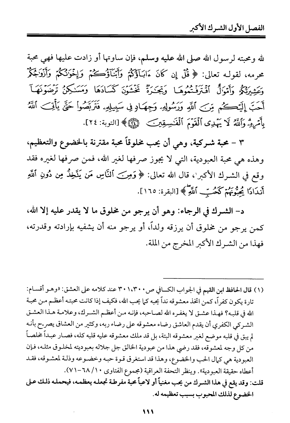 (¬١) قال الحافظ ابن القيم في الجواب الكافي ص ٣٠٠، ٣٠١ عند كلامه على العشق: "وهو أقسام: تارة يكون كفرًا، كمن اتخذ معشوقه ندًا يحبه كما يحب الله، فكيف إذا كانت محبته أعظم من محبة الله في قلبه؟ فهذا عشق لا يغفره الله لصاحبه، فإنه من أعظم الشرك، وعلامة هذا العشق الشركي الكفري أن يقدم العاشق رضاء معشوقه على رضاء ربه، وكثير من العشاق يصرح بأنه لم يبق في قلبه موضع لغير معشوقه البتة، بل قد ملك معشوقه عليه قلبه كله، فصار عبدًا مخلصًا من كل وجه لمعشوقه، فقد رضي هذا من عبودية الخالق جل جلاله بعبوديته لمخلوق مثله، فإن العبودية هي كمال الحب والخضوع، وهذا قد استغرق قوة حبه وخضوعه وذلة لمعشوقه، فقد أعطاه حقيقة العبودية". وينظر التحفة العراقية (مجموع الفتاوى ١٠/ ٦٨ - ٧١).