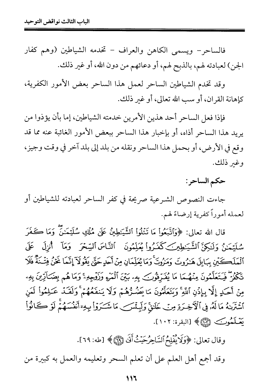 قال الله تعالى: {وَاتَّبَعُوا مَا تَتْلُو الشَّيَاطِينُ عَلَى مُلْكِ سُلَيْمَانَ وَمَا كَفَرَ سُلَيْمَانُ وَلَكِنَّ الشَّيَاطِينَ كَفَرُوا يُعَلِّمُونَ النَّاسَ السِّحْرَ وَمَا أُنْزِلَ عَلَى الْمَلَكَيْنِ بِبَابِلَ هَارُوتَ وَمَارُوتَ وَمَا يُعَلِّمَانِ مِنْ أَحَدٍ حَتَّى يَقُولَا إِنَّمَا نَحْنُ فِتْنَةٌ فَلَا تَكْفُرْ فَيَتَعَلَّمُونَ مِنْهُمَا مَا يُفَرِّقُونَ بِهِ بَيْنَ الْمَرْءِ وَزَوْجِهِ وَمَا هُمْ بِضَارِّينَ بِهِ مِنْ أَحَدٍ إِلَّا بِإِذْنِ اللَّهِ وَيَتَعَلَّمُونَ مَا يَضُرُّهُمْ وَلَا يَنْفَعُهُمْ وَلَقَدْ عَلِمُوا لَمَنِ اشْتَرَاهُ مَا لَهُ فِي الْآخِرَةِ مِنْ خَلَاقٍ وَلَبِئْسَ مَا شَرَوْا بِهِ أَنْفُسَهُمْ لَوْ كَانُوا يَعْلَمُونَ (١٠٢)} [البقرة: ١٠٢].