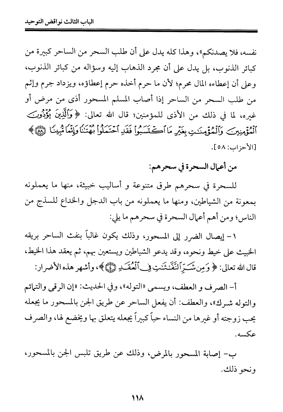 نفسه، فلا يصدنكم"، وهذا كله يدل على أن طلب السحر من الساحر كبيرة من كبائر الذنوب، بل يدل على أن مجرد الذهاب إليه وسؤاله من كبائر الذنوب، وعلى أن إعطاءه المال محرم؛ لأن ماحرم أخذه حرم إعطاؤه، ويزداد جرم أو من السحر من الساحر إذا أصاب المسلم المسحور أذى من مرض أو غيره، لما في ذلك من الأذى للمؤمنين؛ قال الله تعالى: {وَالَّذِينَ يُؤْذُونَ الْمُؤْمِنِينَ وَالْمُؤْمِنَاتِ بِغَيْرِ مَا اكْتَسَبُوا فَقَدِ احْتَمَلُوا بُهْتَانًا وَإِثْمًا مُبِينًا (٥٨)} [الأحزاب: ٥٨].