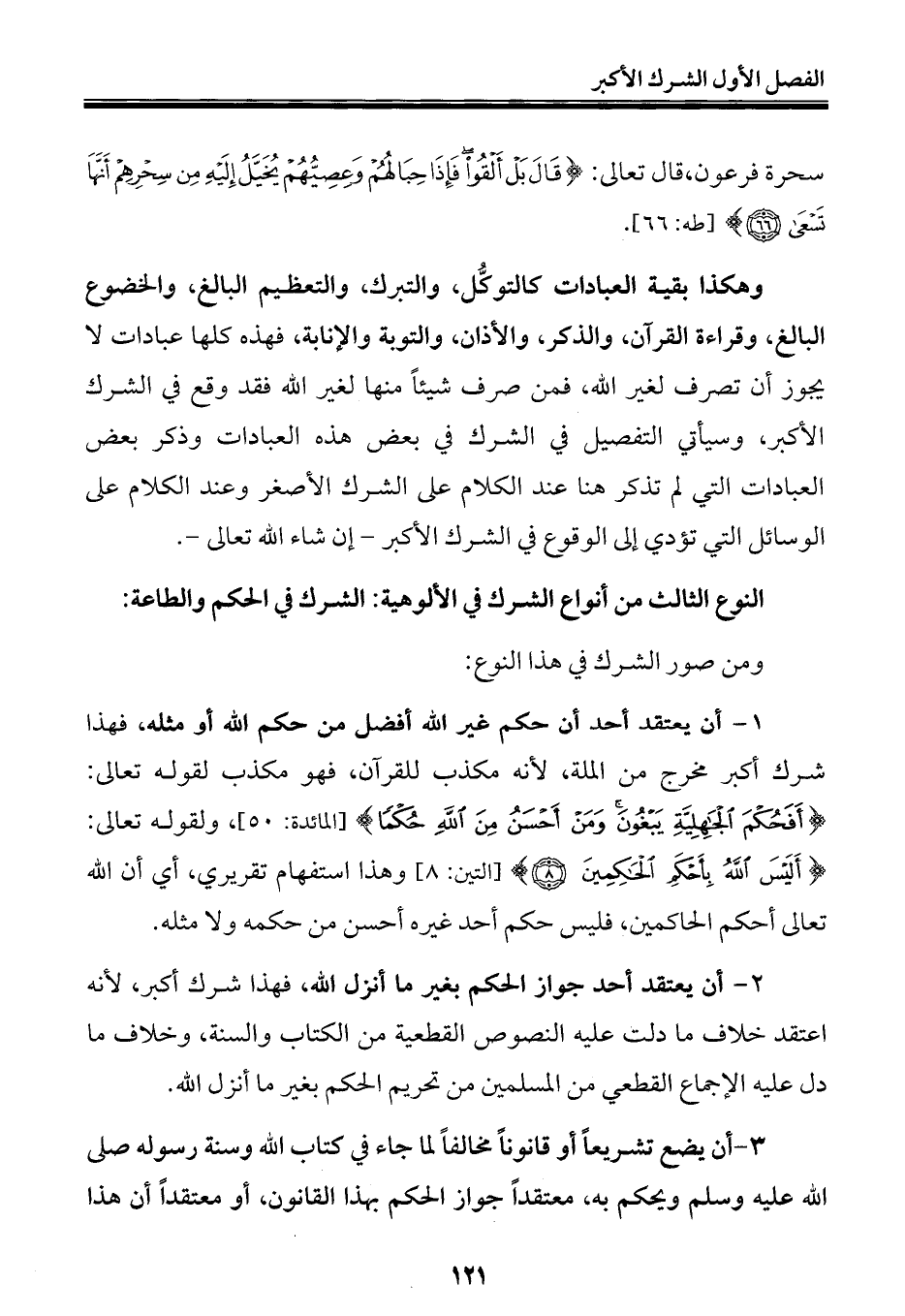 ١ - أن يعتقد أحد أن حكم غير الله أفضل من حكم الله أو مثله، فهذا شرك أكبر مخرج من الملة، لأنه مكذب للقرآن، فهو مكذب لقوله تعالى: {أَفَحُكْمَ الْجَاهِلِيَّةِ يَبْغُونَ وَمَنْ أَحْسَنُ مِنَ اللَّهِ حُكْمًا} [المائدة: ٥٠]، ولقوله تعالى: {أَلَيْسَ اللَّهُ بِأَحْكَمِ الْحَاكِمِينَ (٨)} [التين: ٨]، وهذا استفهام تقريري، أي أن الله تعالى أحكم الحاكمين، فليس حكم أحد غيره أحسن من حكمه ولا مثله.