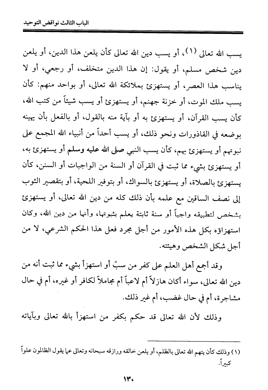 يسب الله تعالى (¬١)، أو يسب دين الله تعالى كأن يلعن هذا الدين، أو يلعن دين شخص مسلم، أو يقول: إن هذا الدين متخلف، أو رجعي، أو لا يناسب هذا العصر، أو يستهزئ بملائكة الله تعالى، أو بواحد منهم: كأن يسب ملك الموت، أو خزنة جهنم، أو يستهزئ أو يسب شيئًا من كتب الله، كأن يسب القرآن، أو يستهزئ به أو بآية منه بالقول، أو بالفعل بأن يهينه بوضعه في القاذووات ونحو ذلك، أو يسب أحدًا من أنبياء الله المجمع على نبوتهم أو يستهزئ بهم، كأن يسب النبي صلى الله عليه وسلم أو يستهزئ به، أو يستهزئ بشيء مما ثبت في القرآن أو السنة من الواجبات أو السنن، كأن يستهزئ بالصلاة، أو يستهزئ بالسواك، أو بتوفير اللحية، أو بتقصير الثوب إلى نصف الساقين مع علمه بأن ذلك كله من دين الله تعالى، أو يستهزئ بشخص لتطبيقه واجبًا أو سنة ثابتة يعلم بثبوتها، وأنها من دين الله، وكان استهزاؤه بكل هذه الأمور من أجل مجرد فعل هذا الحكم الشرعي، لا من أجل شكل الشخصى وهيئته.