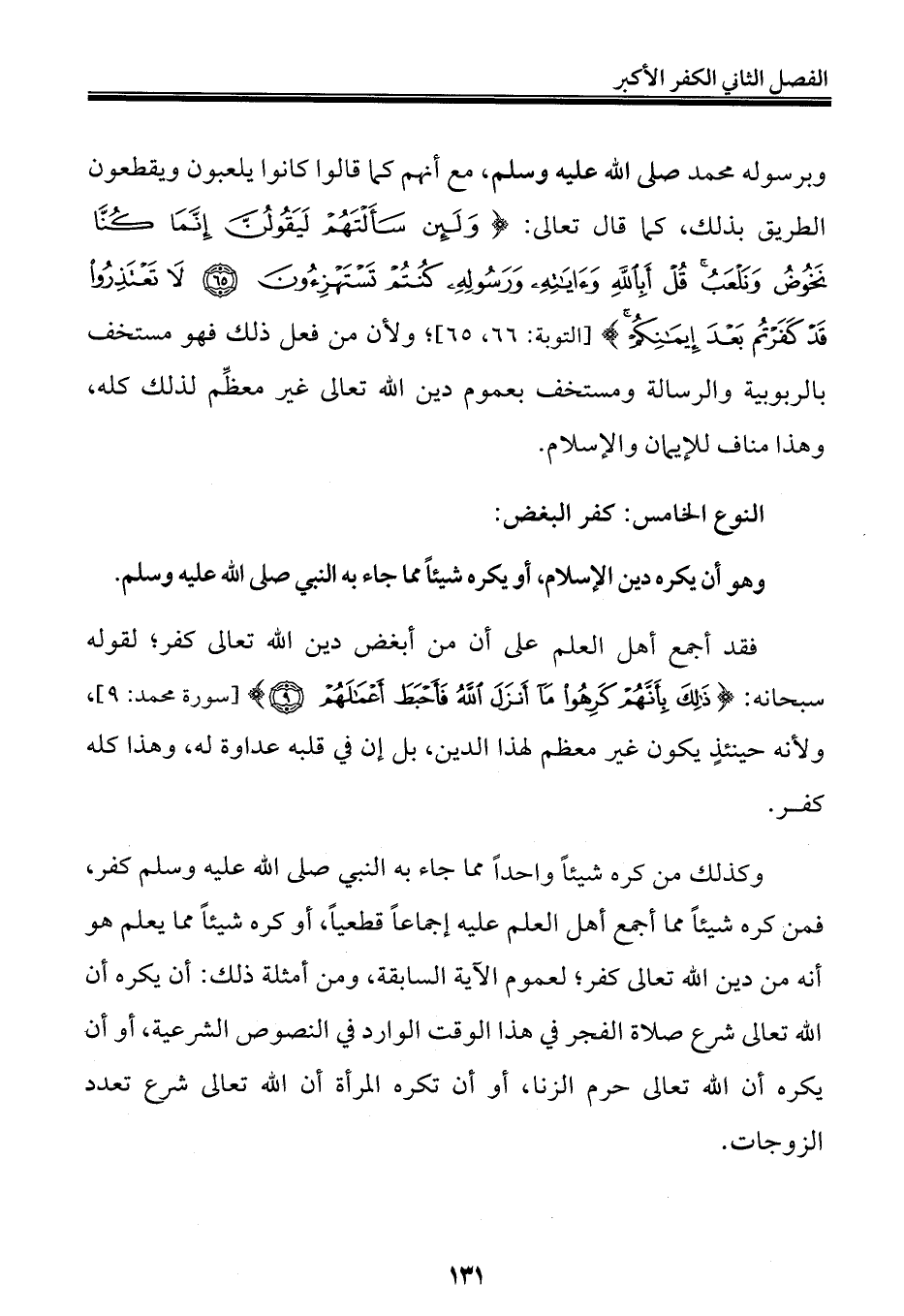 وبرسوله محمد صلى الله عليه وسلم، مع أنهم كما قالوا كانوا يلعبون ويقطعون الطريق بذلك، كما قال تعالى: {وَلَئِنْ سَأَلْتَهُمْ لَيَقُولُنَّ إِنَّمَا كُنَّا نَخُوضُ وَنَلْعَبُ قُلْ أَبِاللَّهِ وَآيَاتِهِ وَرَسُولِهِ كُنْتُمْ تَسْتَهْزِئُونَ (٦٥) لَا تَعْتَذِرُوا قَدْ كَفَرْتُمْ بَعْدَ إِيمَانِكُمْ} [التوبة: ٦٥، ٦٦]؛ ولأن من فعل ذلك فهو مستخف بالربوبية والرسالة ومستخف بعموم دين الله تعالى غير معظِّم لذلك كله، وهذا مناف للإيمان والإسلام.