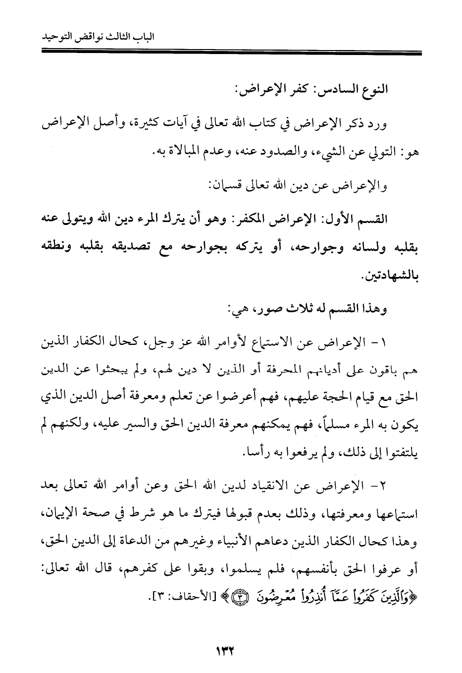 القسم الأول: الإعراض المكفر: وهو أن يترك المرء دين الله ويتولى عنه بقلبه ولسانه وجوارحه، أو يتركه بجوارحه مع تصديقه بقلبه ونطقه بالشهادتين.