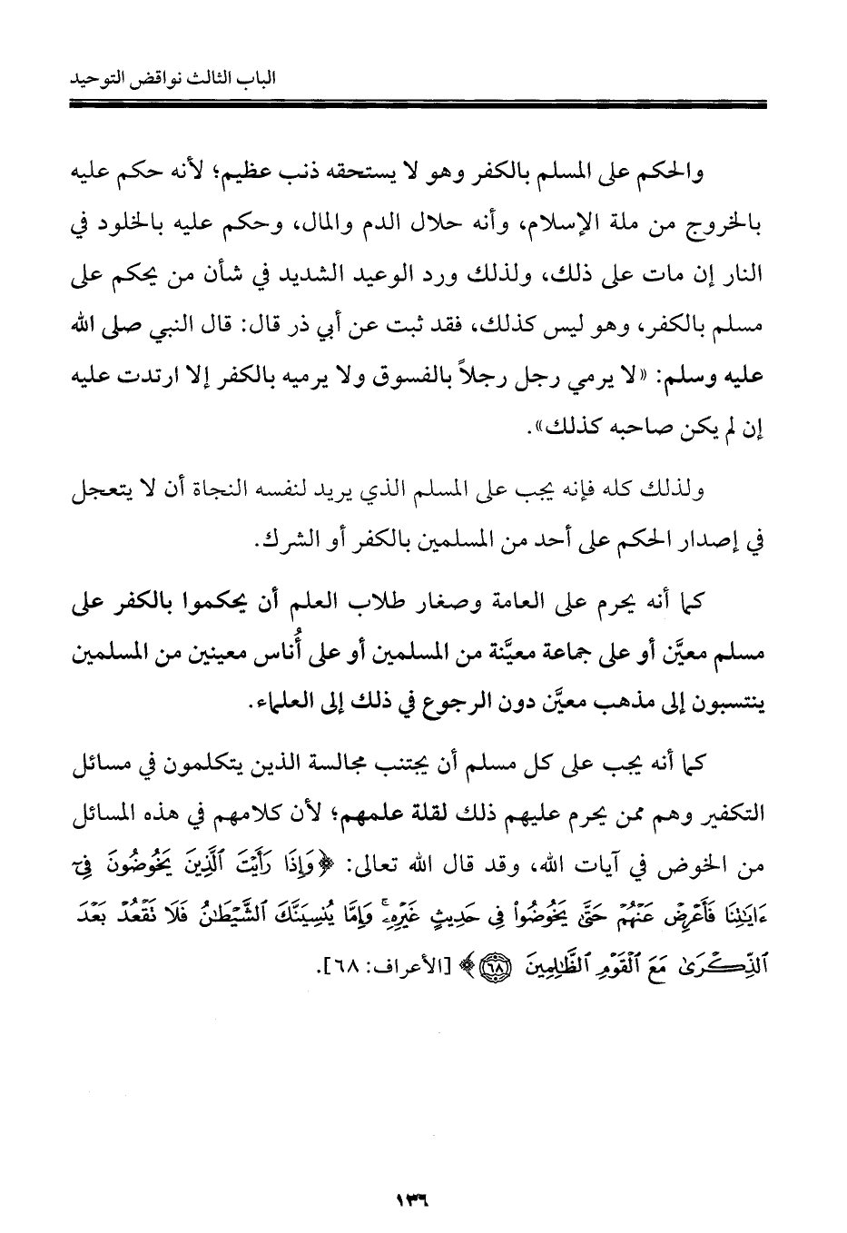 كما أنة يحرم على العامة وصغار طلاب العلم أن يحكموا بالكفر على مسلم معيَّن أو على جماعة معيَّنة من المسلمين أو على أُناس معينين من المسلمين ينتسبون إلى مذهب معيَّن دون الرجوع في ذلك إلى العلماء.