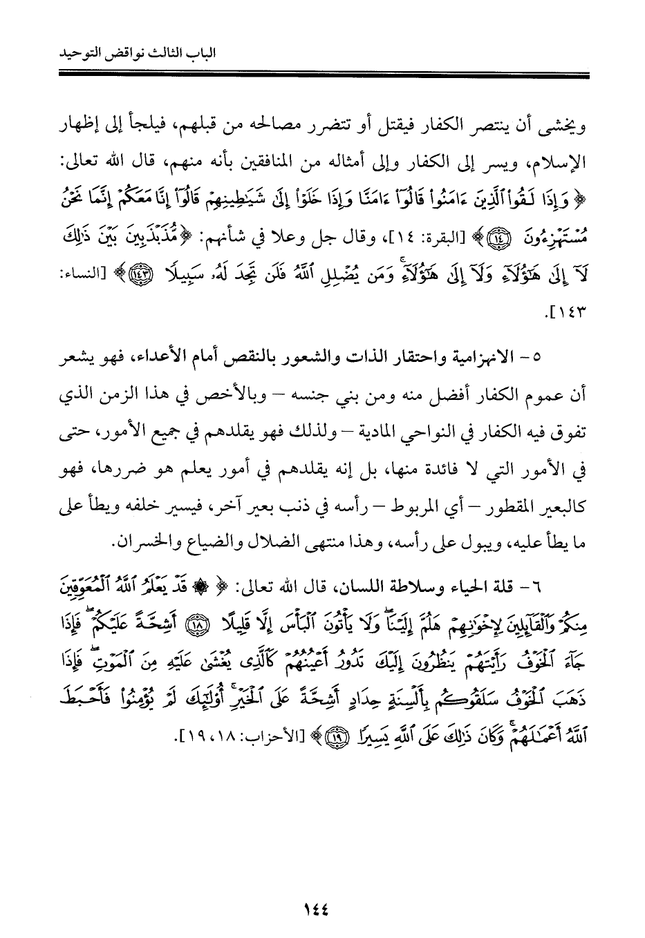 ٥ - الانهزامية واحتقار الذات والشعور بالنقص أمام الأعداء، فهو يشعر أن عموم الكفار أفضل منه ومن بني جنسه - وبالأخص في هذا الزمن الذي تفوق فيه الكفار في النواحي المادية - ولذلك فهو يقلدهم في جميع الأمور، حتى في الأمور التي لا فائدة منها، بل إنه يقلدهم في أمور يعلم هو ضررها، فهو كالبعير المقطور - أي المربوط - رأسه في ذنب بعير آخر، فيسير خلفه ويطأ على ما يطأ عليه، ويبول على رأسه، وهذا منتهى الضلال والضياع والخسران.