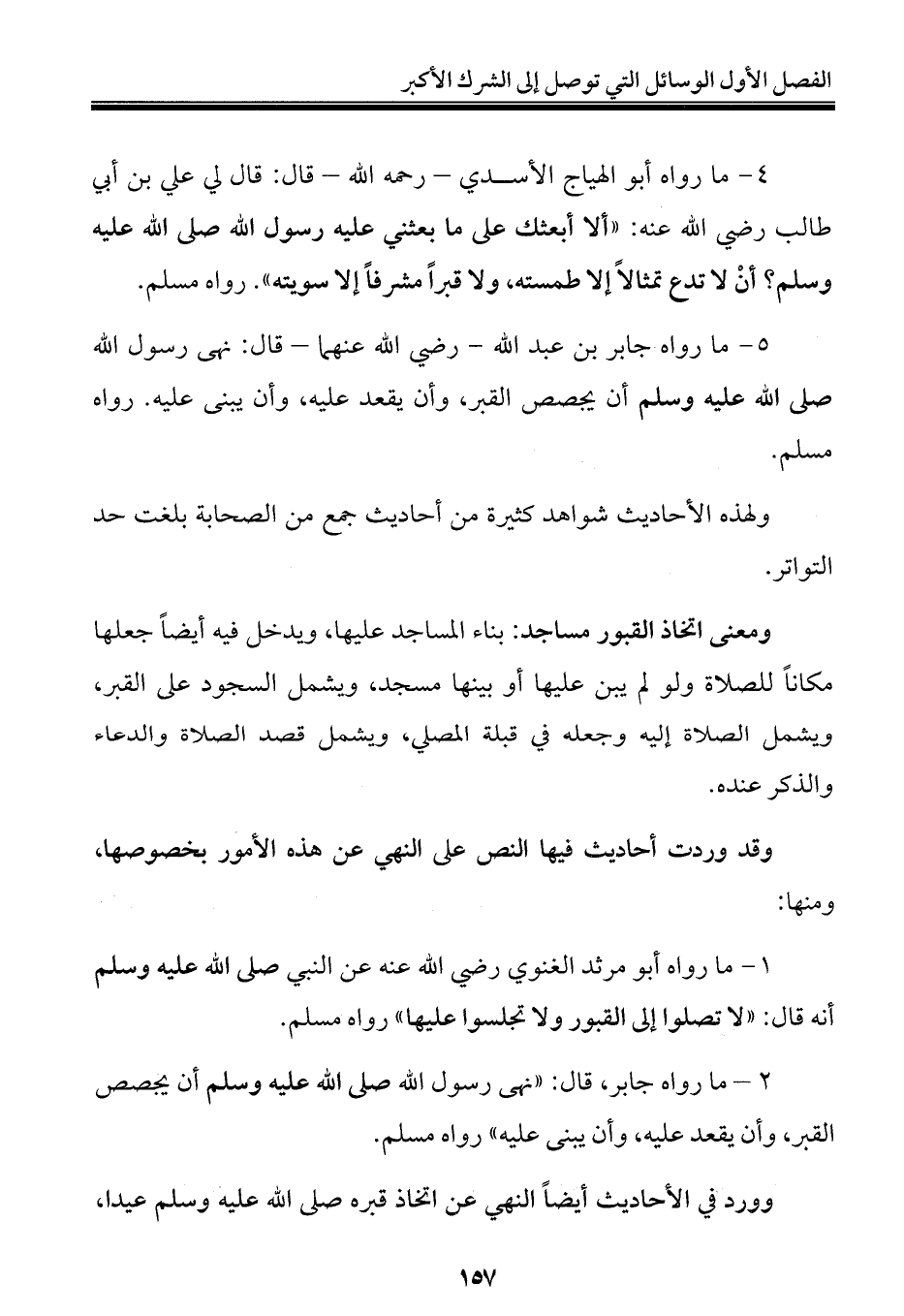 ٤ - ما رواه أبو الهياج الأسدي - رحمه الله - قال: قال لي علي بن أبي طالب رضي الله عنه: "ألا أبعثك على ما بعثني عليه رسول الله صلى الله عليه وسلم؟ أنْ لا تدع تمثالًا إلا طمسته، ولا قبرًا مشرفًا إلا سويته". رواه مسلم.