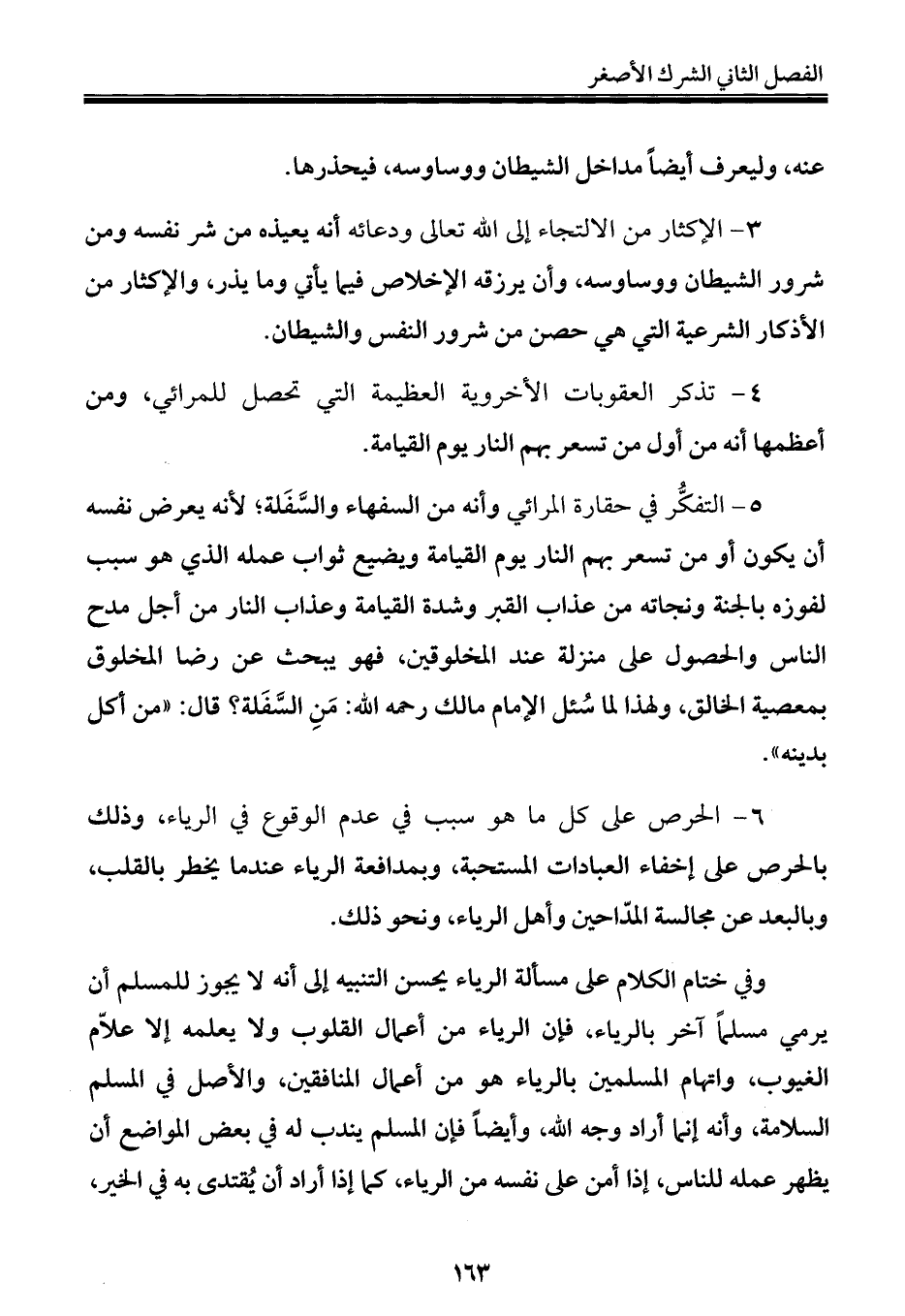 ٦ - الحرص على كل ما هو سبب في عدم الوقوع في الرياء، وذلك بالحرص على إخفاء العبادات المستحبة، وبمدافعة الرياء عندما يخطر بالقلب، وبالبعد عن مجالسة المدّاحين وأهل الرياء، ونحو ذلك.