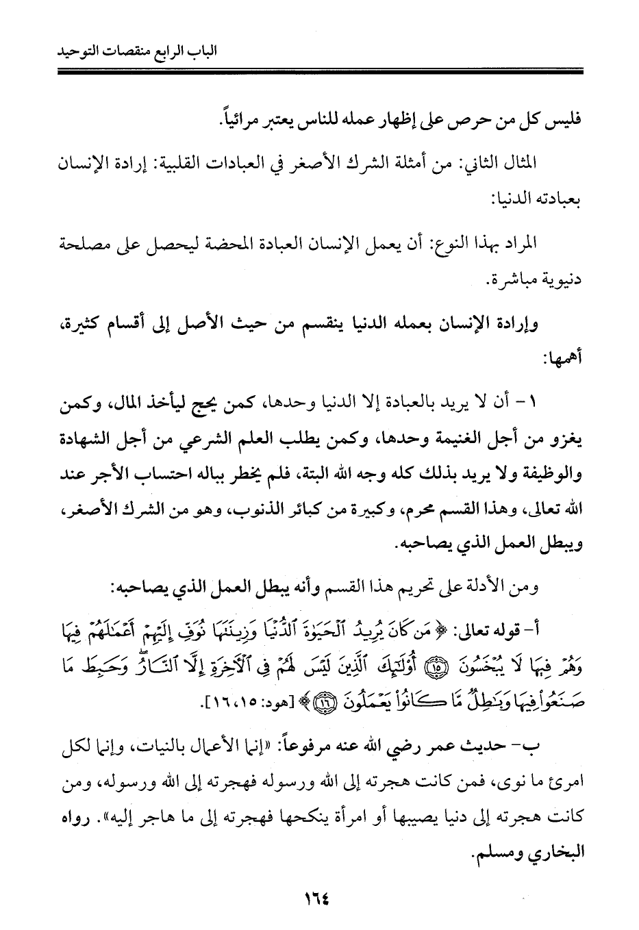 المثال الثاني: من أمثلة الشرك الأصغر في العبادات القلبية: إرادة الإنسان بعبادته الدنيا:
