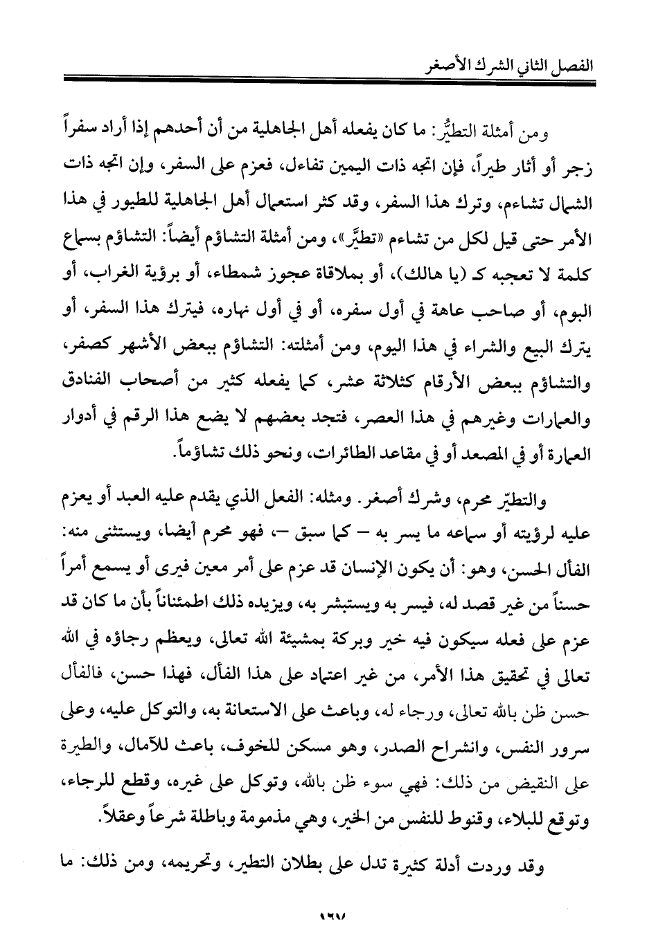 والتطيّر محرم، وشرك أصغر. ومثله: الفعل الذي يقدم عليه العبد أو يعزم عليه لرؤيته أو سماعه ما يسر به - كما سبق -، فهو محرم أيضا، ويستثنى منه: الفأل الحسن، وهو: أن يكون الإنسان قد عزم على أمر معين فيرى أو يسمع أمرًا حسنًا من غير قصد له، فيسر به ويستبشر به، ويزيده ذلك اطمئنانًا بأن ما كان قد عزم على فعله سيكون فيه خير وبركة بمشيئة الله تعالى، ويعظم رجاؤه في الله تعالى في تحقيق هذا الأمر، من غير اعتماد على هذا الفأل، فهذا حسن، فالفأل حسن ظن بالله تعالى، ورجاء له، وباعث على الاستعانة به، والتوكل عليه، وعلى سرور النفس، وانشراح الصدر، وهو مسكن للخوف، باعث للآمال، والطيرة على النقيض من ذلك: فهي سوء ظن بالله، وتوكل على غيره، وقطع للرجاء، وتوقع للبلاء، وقنوط للنفس من الخير، وهي مذمومة وباطلة شرعًا وعقلًا.