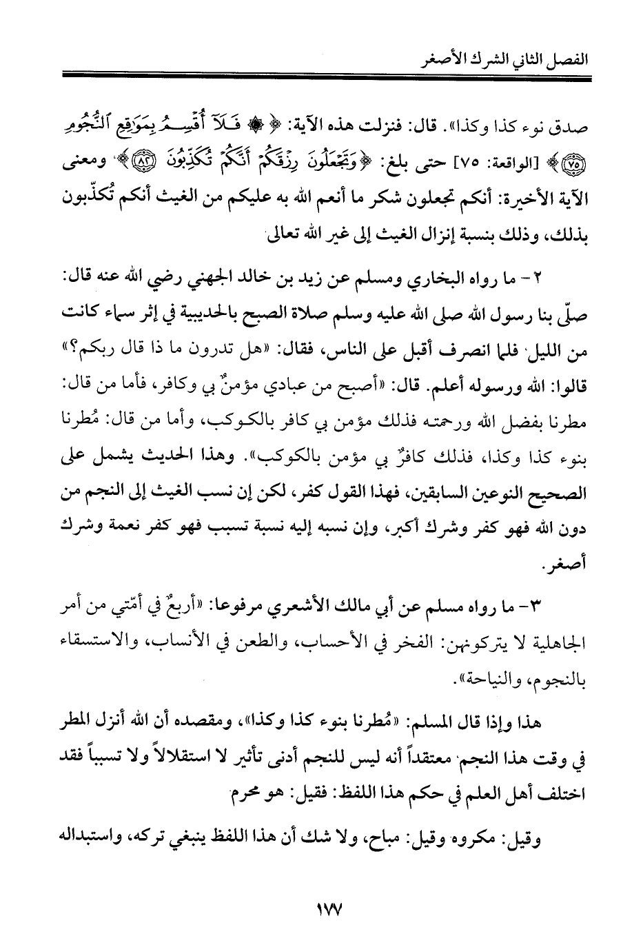 ٢ - ما رواه البخاري ومسلم عن زيد بن خالد الجهني رضي الله عنه قال: صلّى بنا رسول الله صلى الله عليه وسلم صلاة الصبح بالحديبية في إثر سماء كانت من الليل فلما انصرف أقبل على الناس، فقال: "هل تدرون ماذا قال ربكم؟ " قالوا: الله ورسوله أعلم. قال: "أصبح من عبادي مؤمنٌ بي وكافر، فأما من قال: مطرنا بفضل الله ورحمته فذلك مؤمن بي كافر بالكوكب، وأما من قال: مُطرنا بنوء كذا وكذا، فذلك كافر بي مؤمن بالكوكب". وهذا الحديث يشمل على الصحيح النوعين السابقين، فهذا القول كفر، لكن إن نسب الغيث إلى النجم من دون الله فهو كفر وشرك أكبر، وإن نسبه إليه نسبة تسبب فهو كفر نعمة وشرك أصغر.